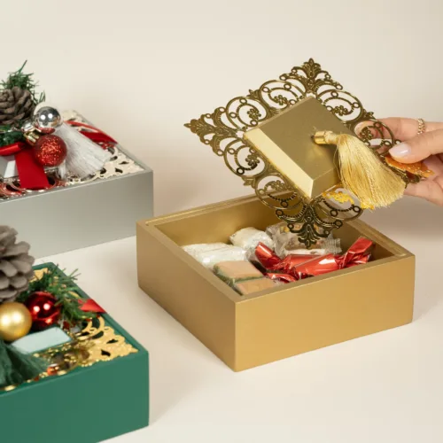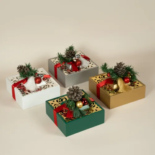 An elegant decorative box with a laser-cut lid, available in four different colors, holds 300 grams of 100% premium Belgian chocolate, topped with holiday-inspired embellishments.