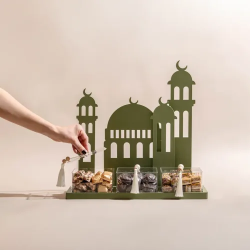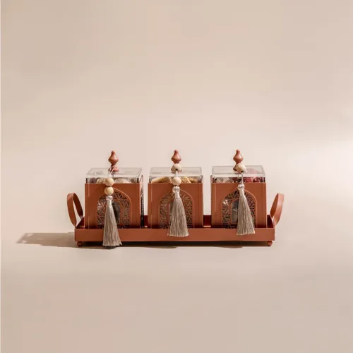 A metallic tray featuring mosque motifs, holding three acrylic boxes with lids and matching tassels, filled with 1.8 kilograms of assorted premium Belgian chocolates and oriental sweets