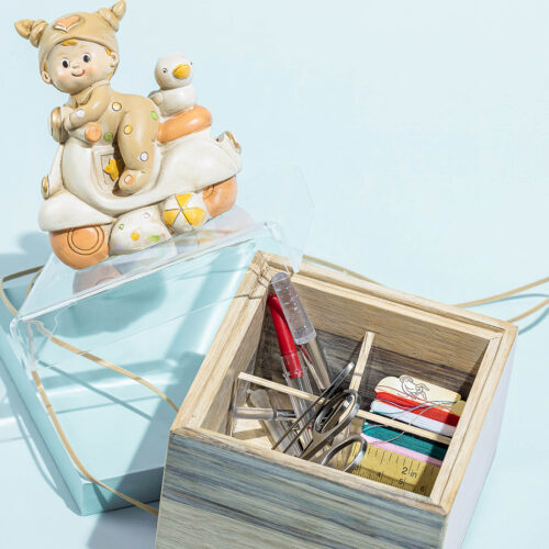 A wooden box with a ceramic baby as a handle holding a sewing kit