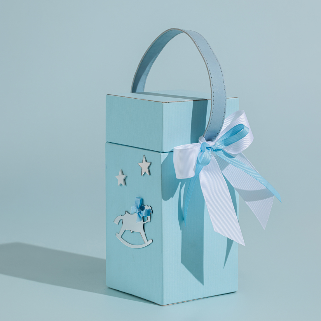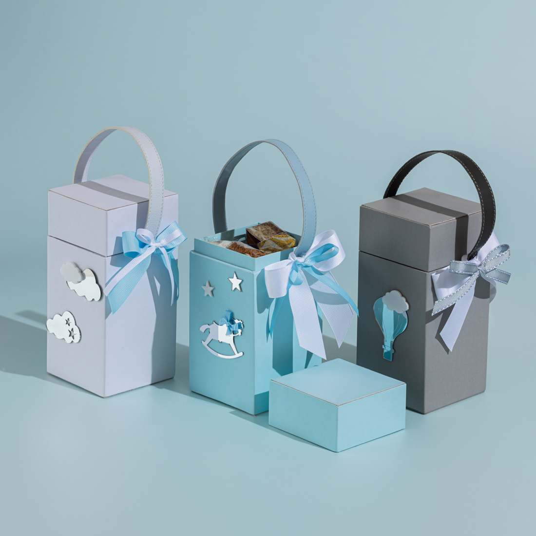 A decorated box bag, designed to be placed within the newborn baby chocolate setup and offered to guests in order to fill their chocolate and sweets preferences. This design acts as a two-in-one: sweet treats and a giveaway.