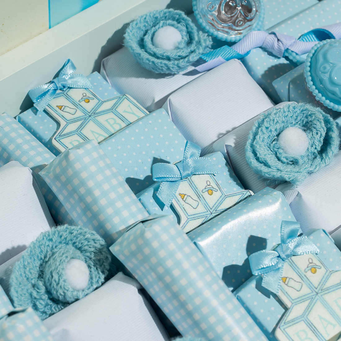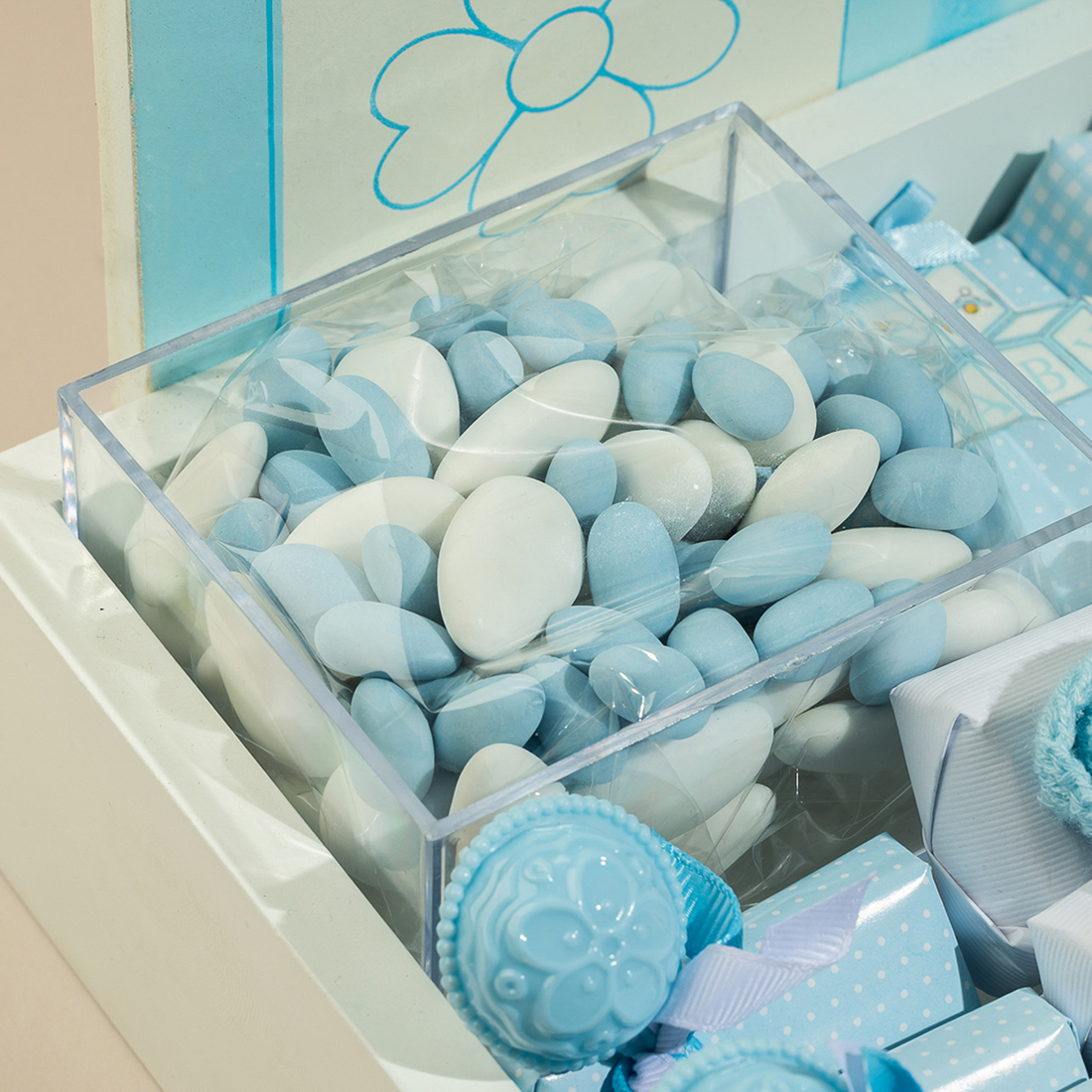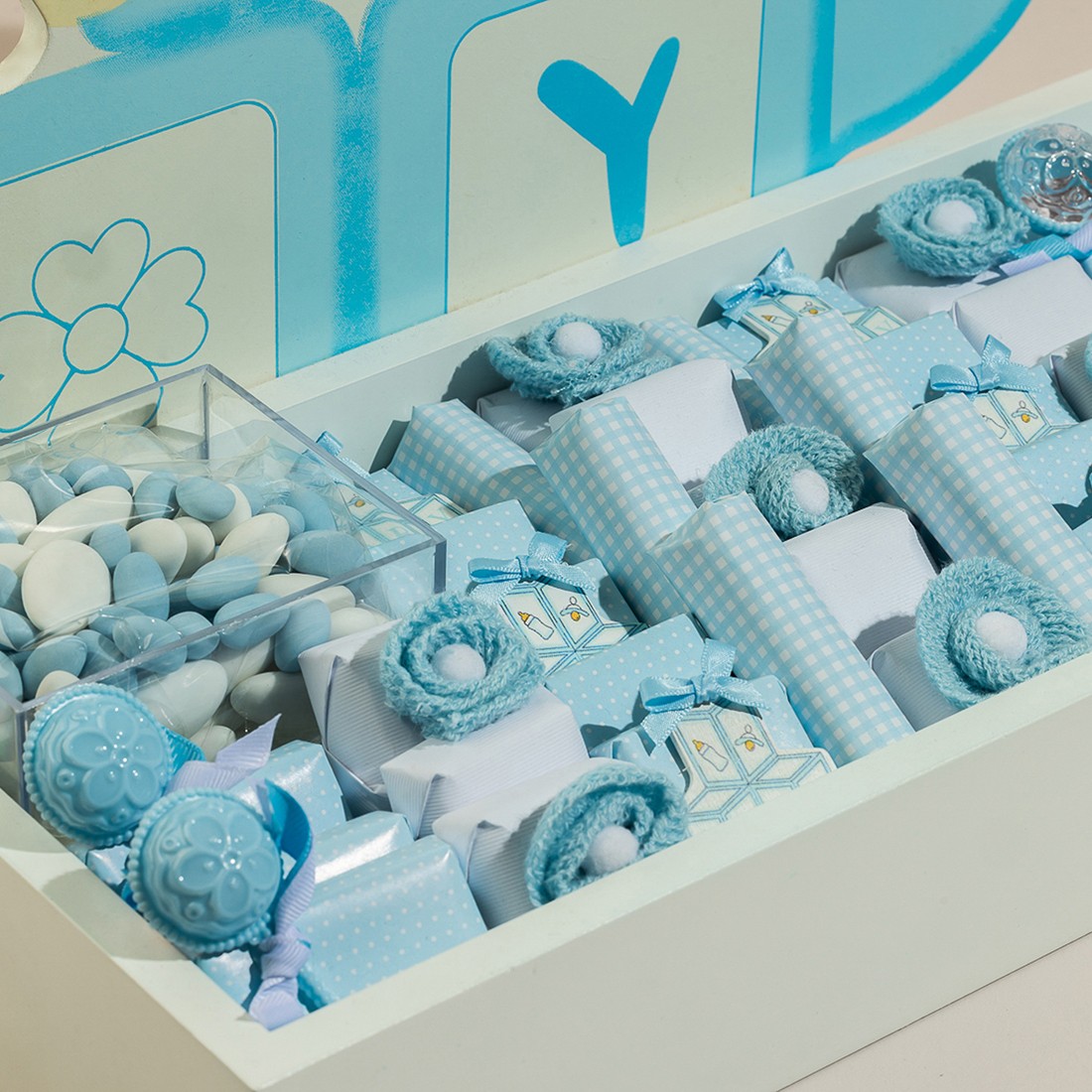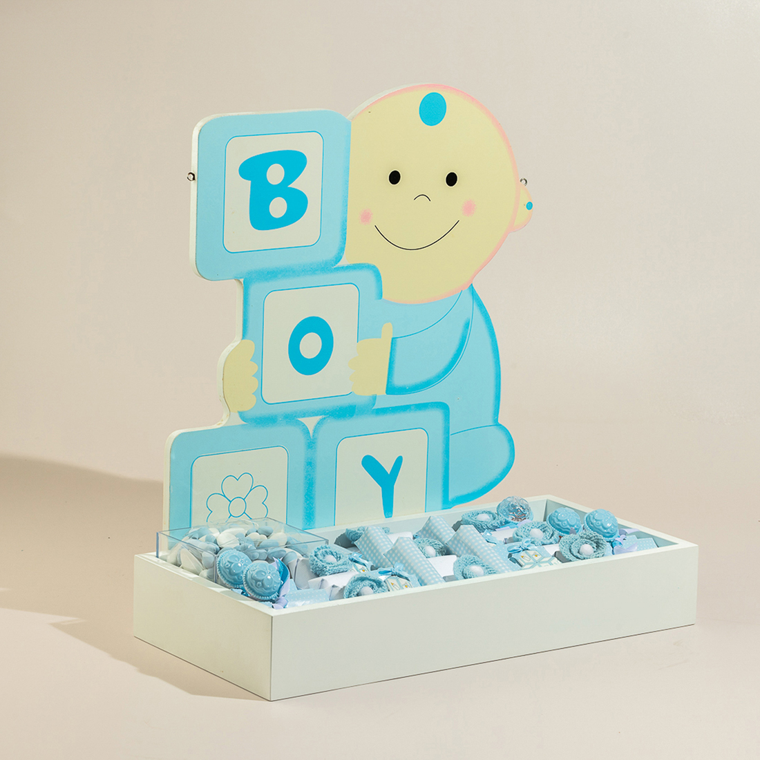 A white, wooden tray, holding 1000 grams of 100% premium Belgian chocolate, sugared almonds and a baby with the gender reveal as a backdrop