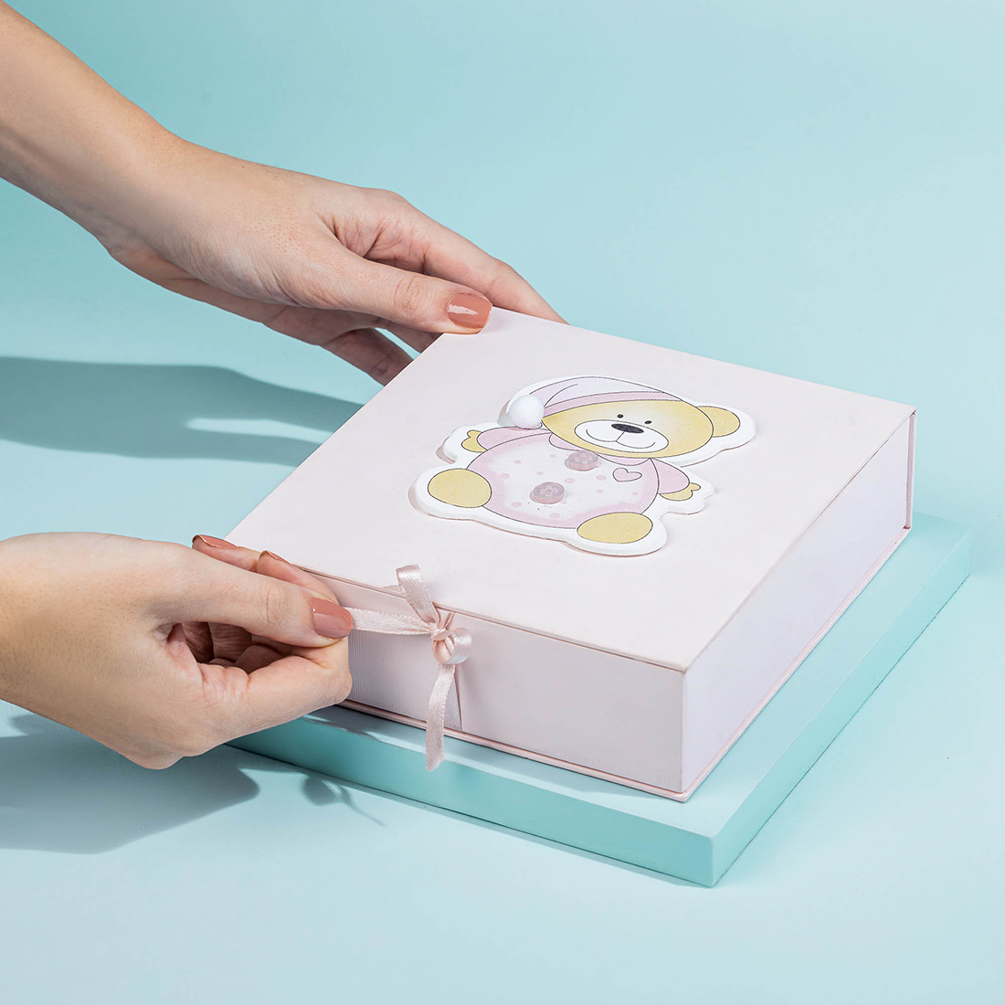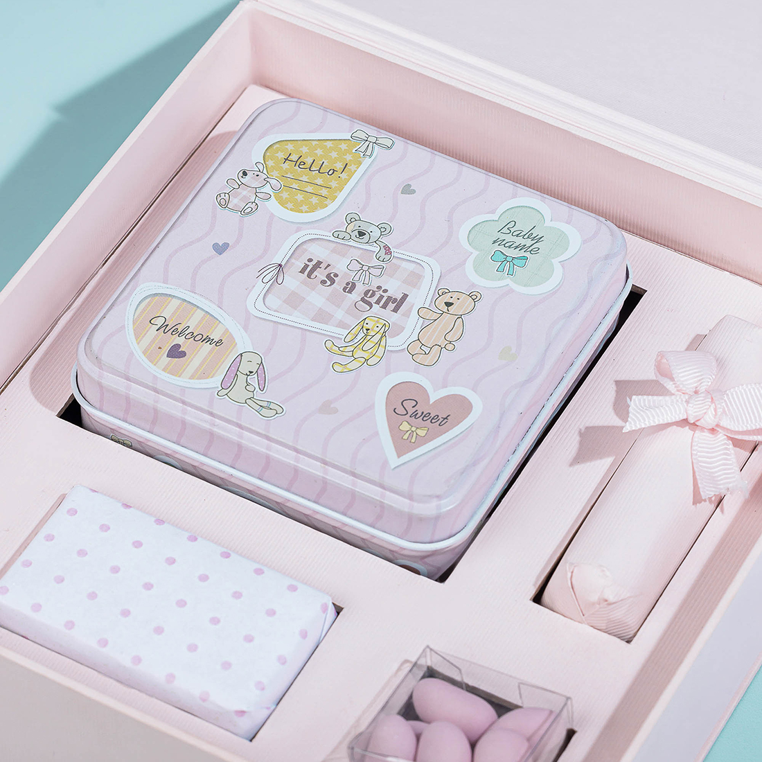 A gift set including a decorated tin box with a candle, two pieces of chocolate and sugared almonds – in a gift box with an adorable teddy bear