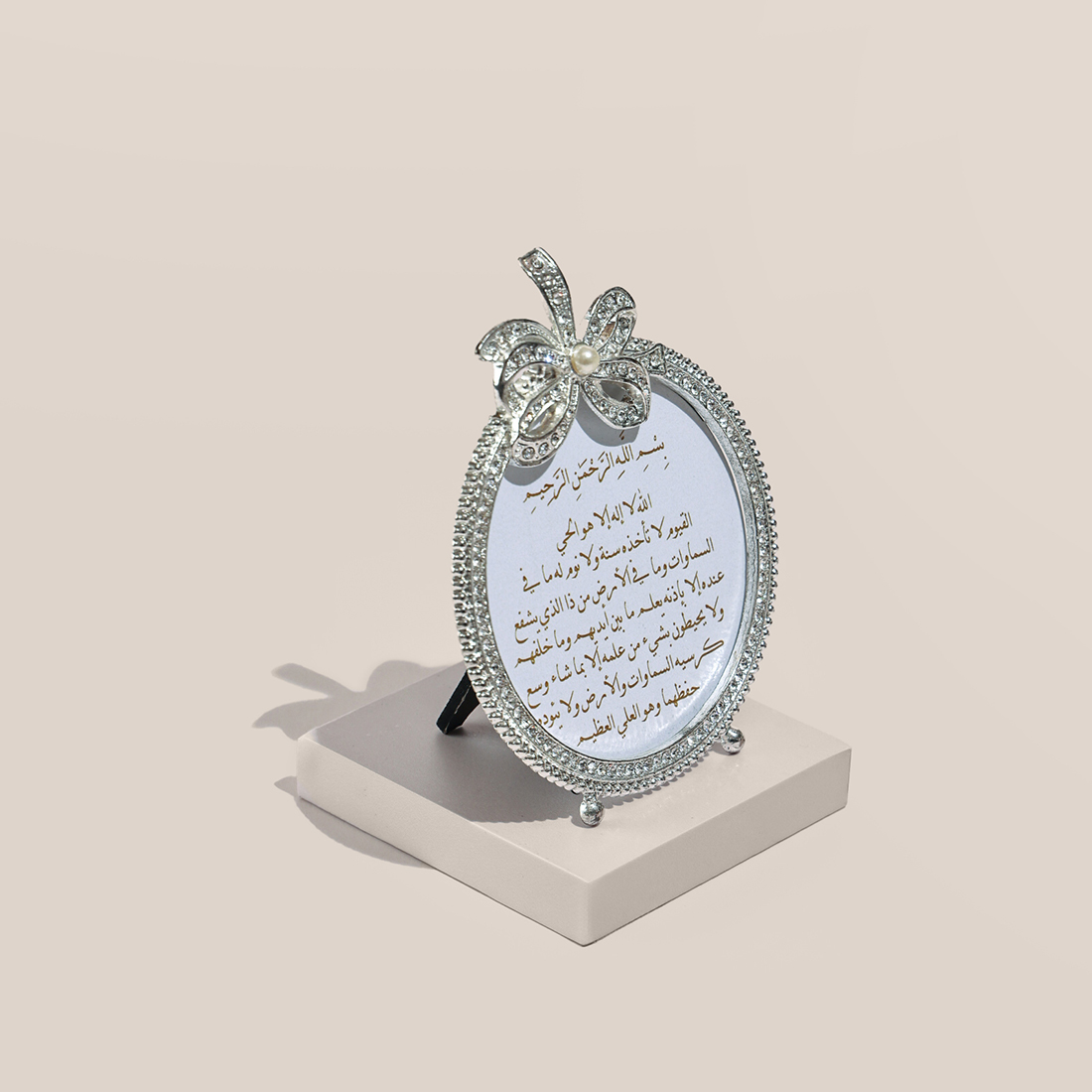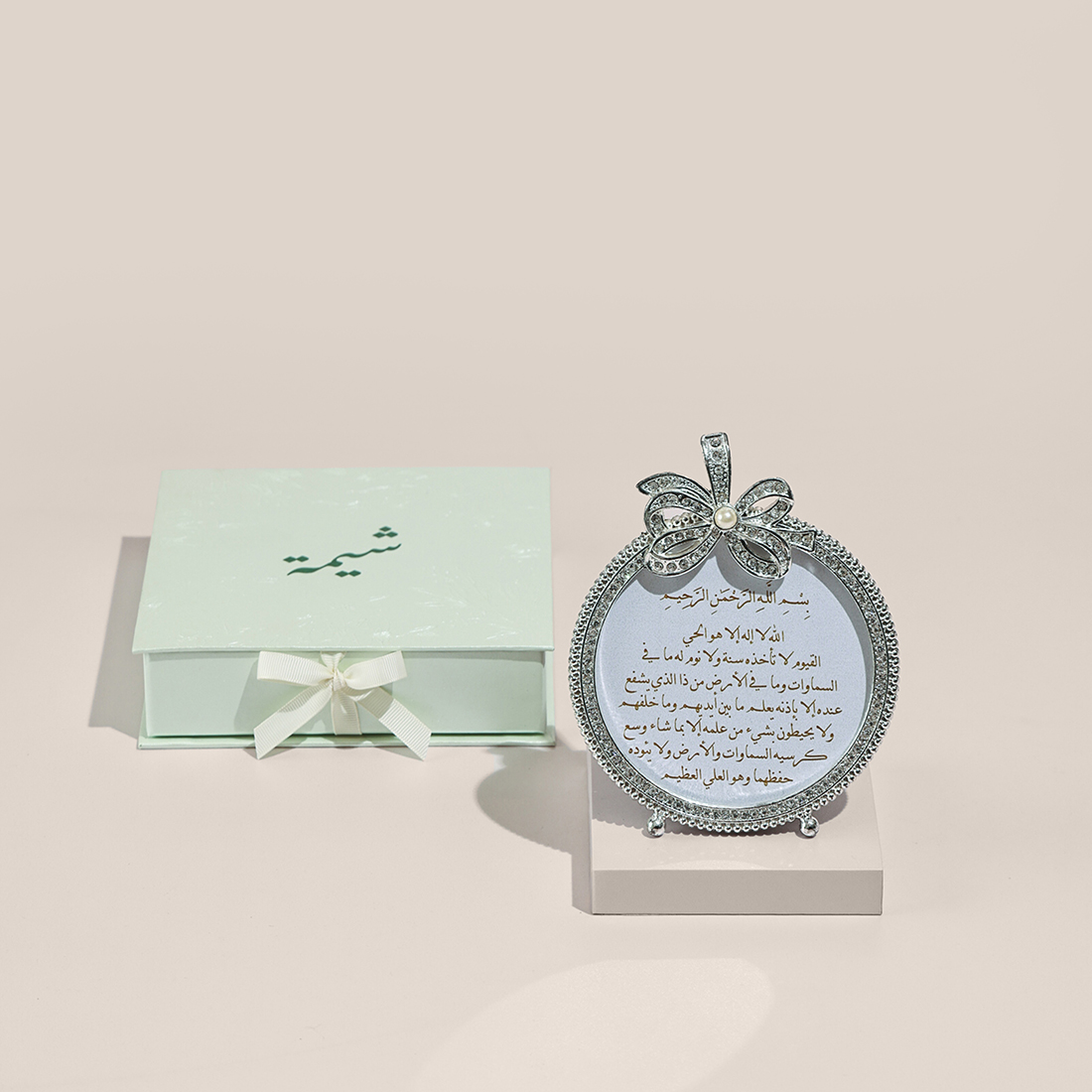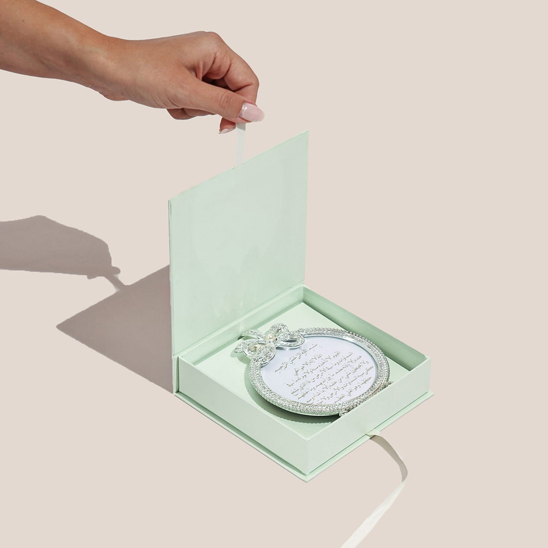 An oval-shaped frame with shiny borders, presented in a mint green customized gift box.