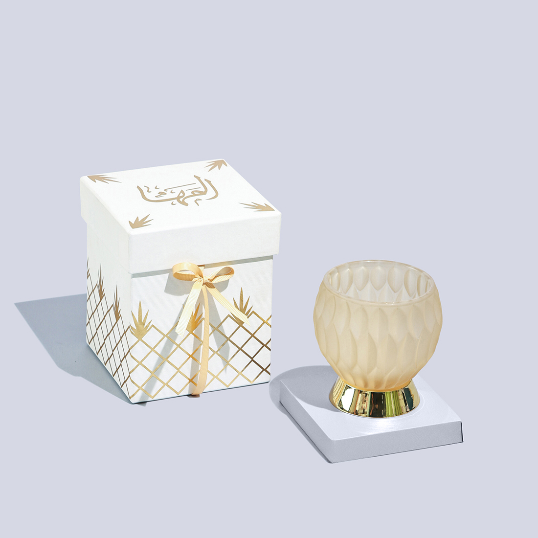 JOD40An amber, frosted glass incense burner placed in a personalised gift box. -