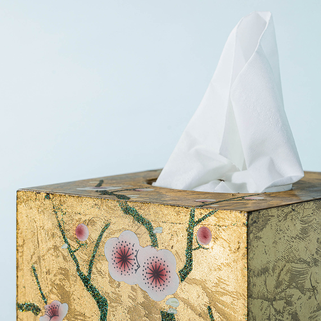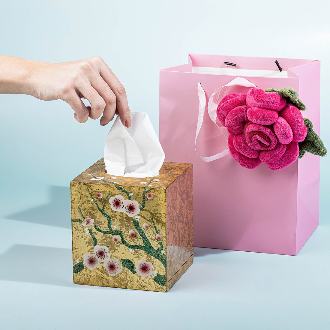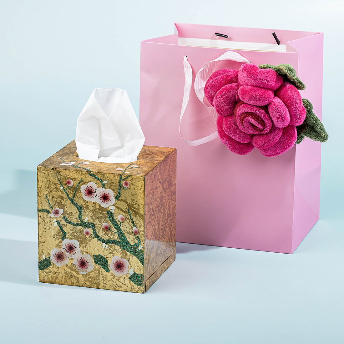 A golden leaf painted wooden napkin holder in a customized bag with a stuffed flower