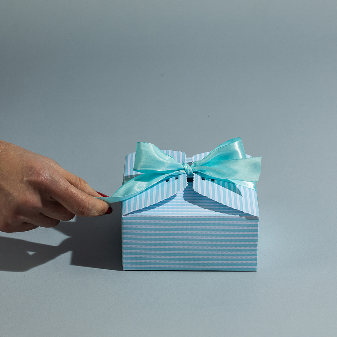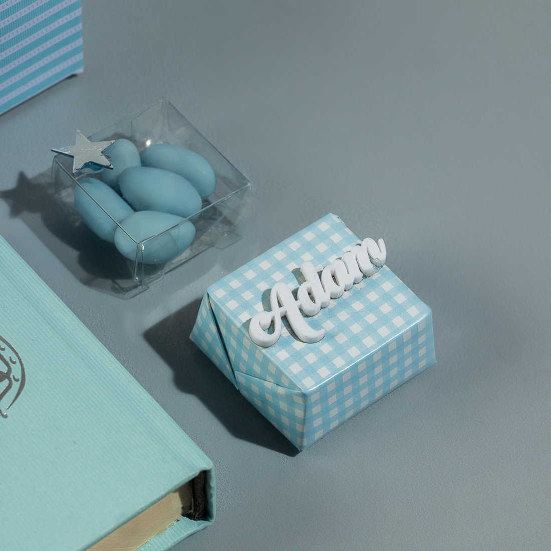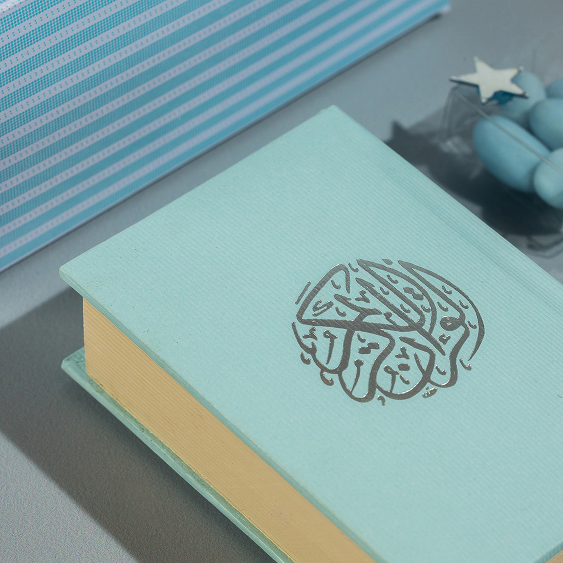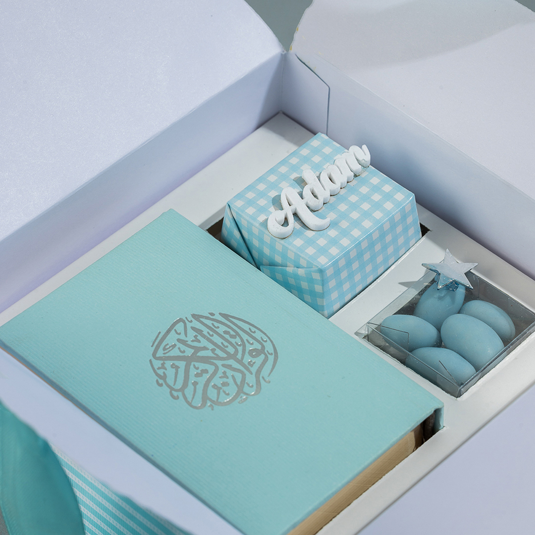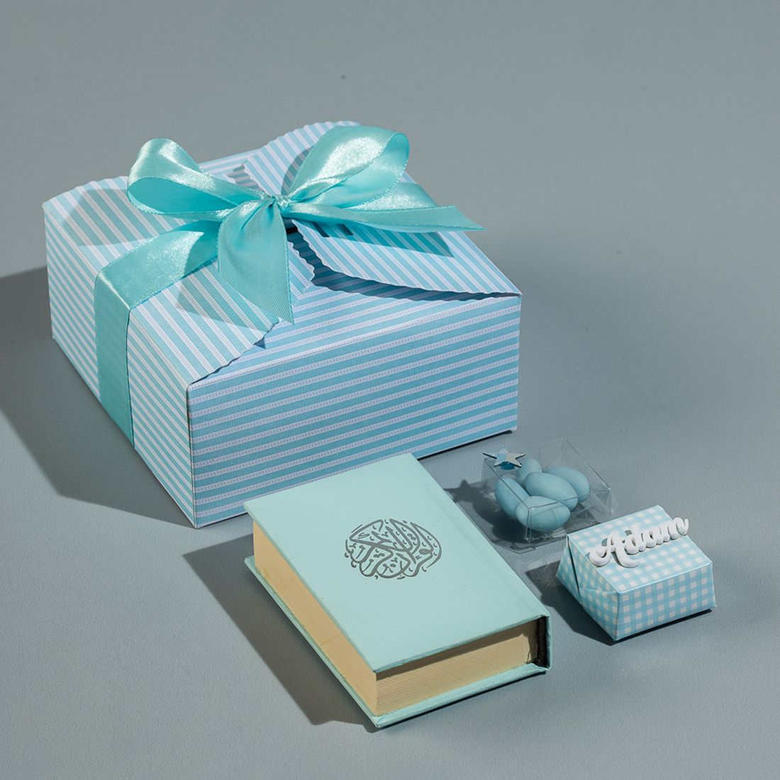 A gift set including the holy Quran, a personalized piece of chocolate and sugared almonds