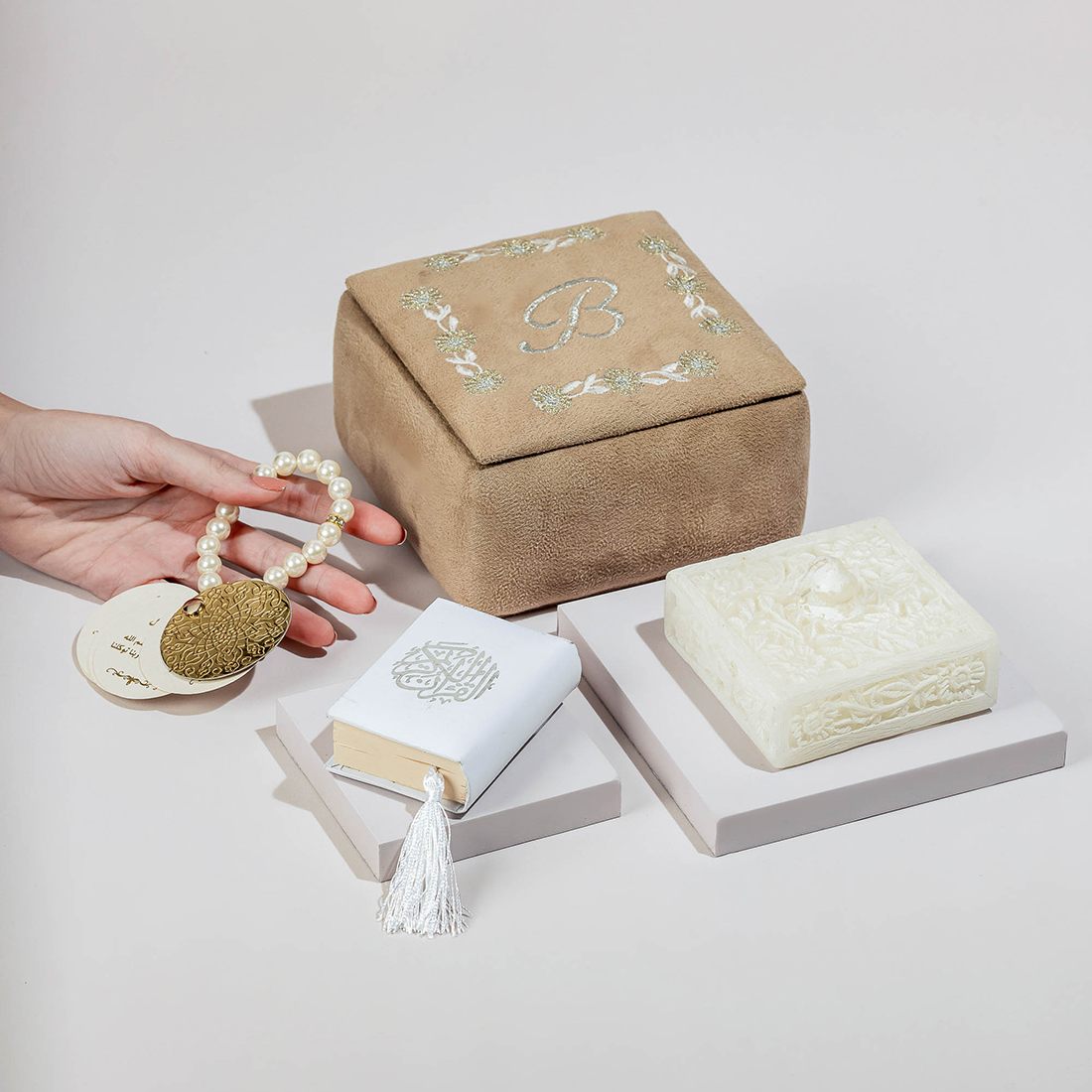 An embroidered velvet box holding the holy Quran, a candle and worry beads with a book of prayers