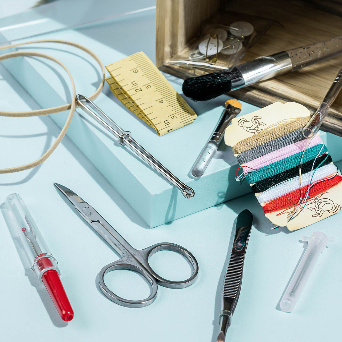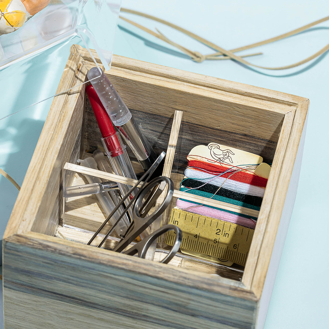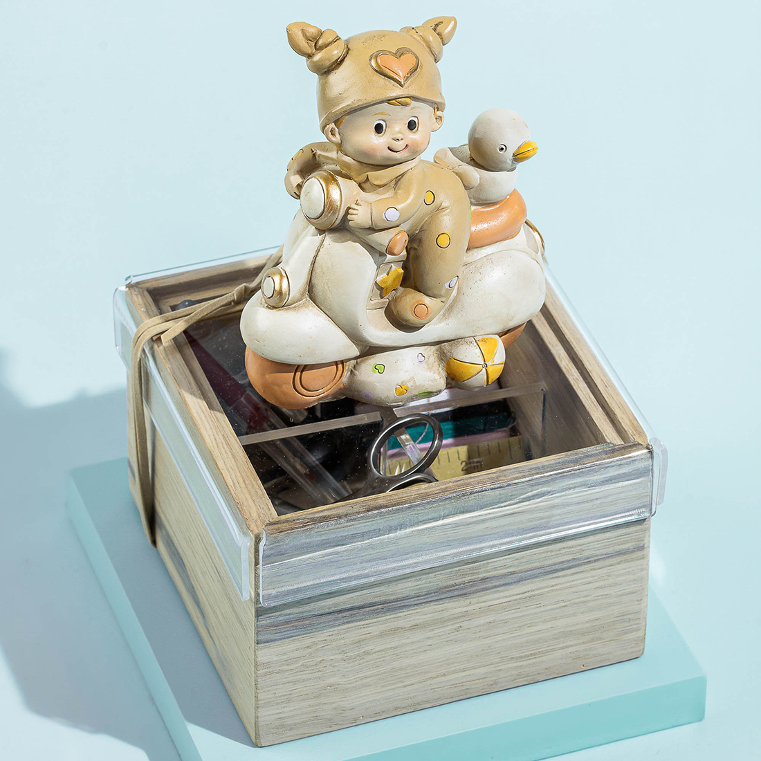A wooden box with a ceramic baby as a handle holding a sewing kit