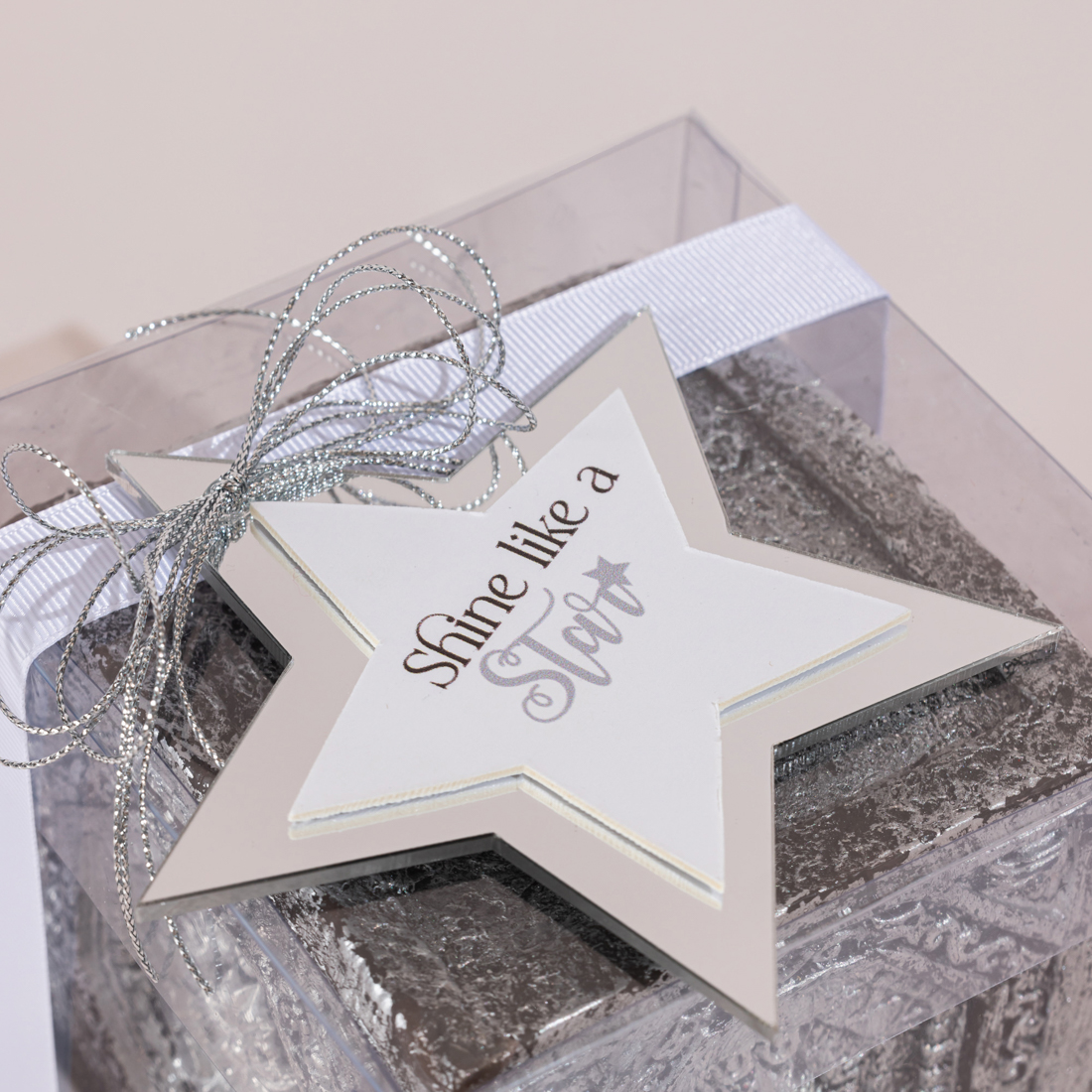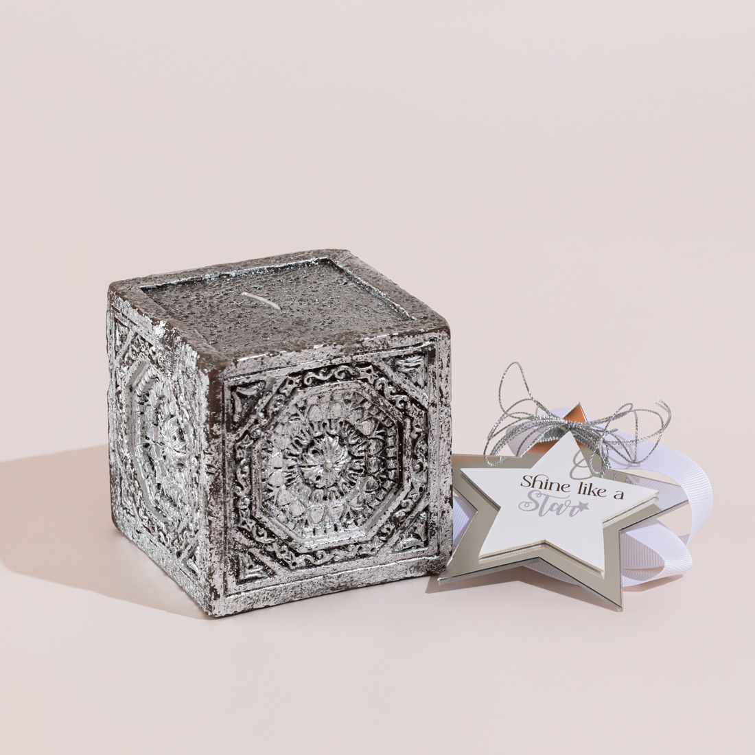 A silver, decorative cubic candle in a decorated box