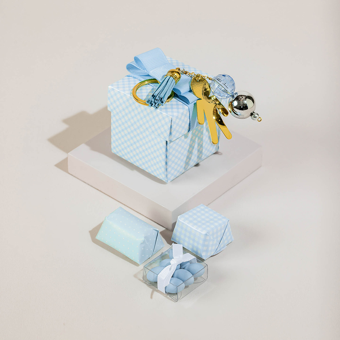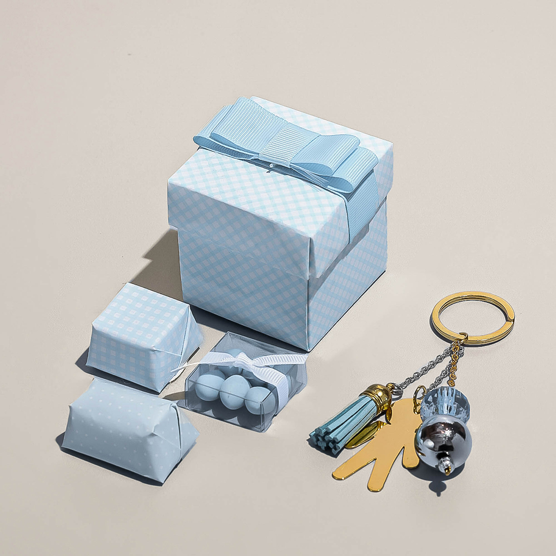 A mini box with a charmed keychain holding two pieces of chocolate and sugared almonds