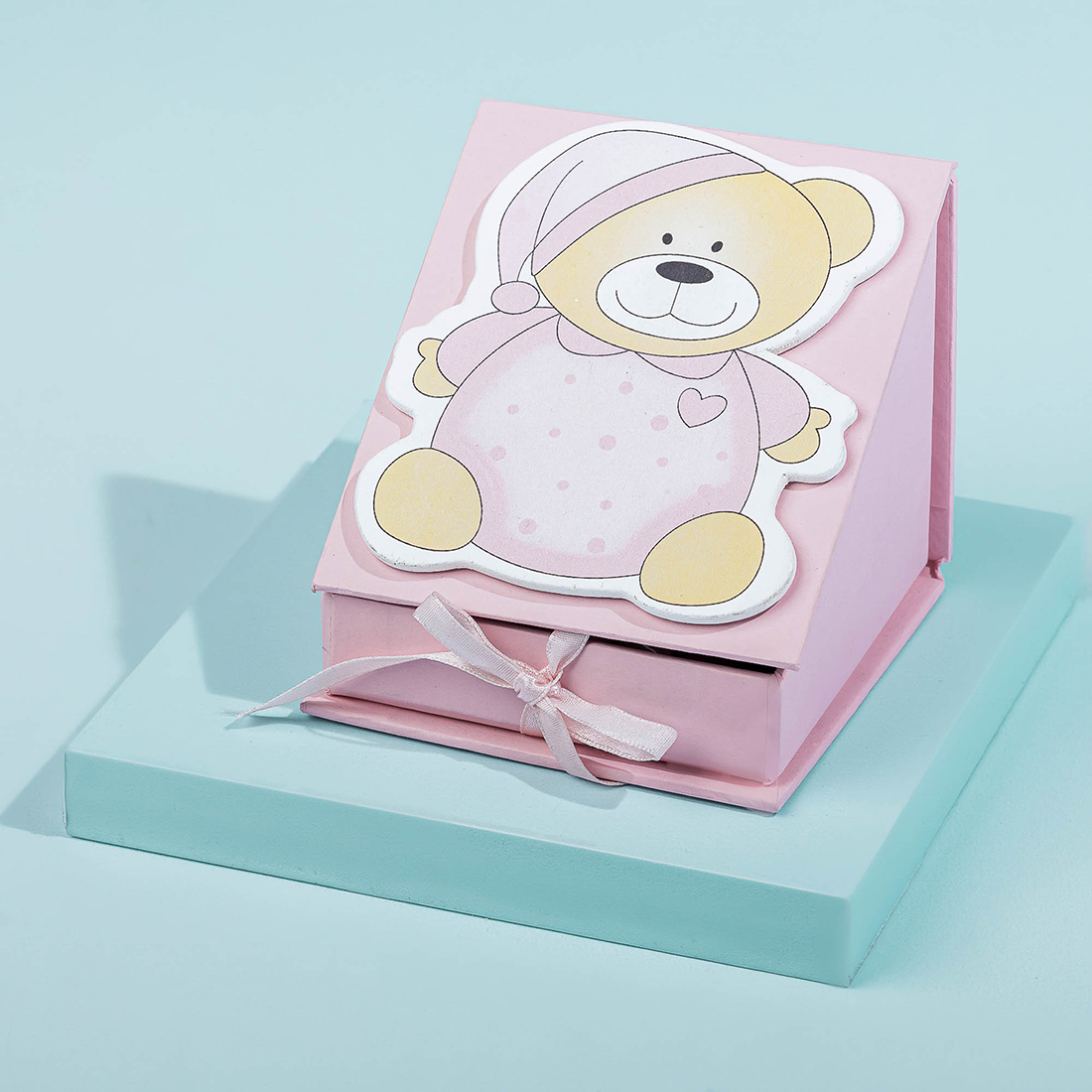 A box decorated with a teddy bear holding three pieces of chocolate, sugared almonds and sugared pistachios