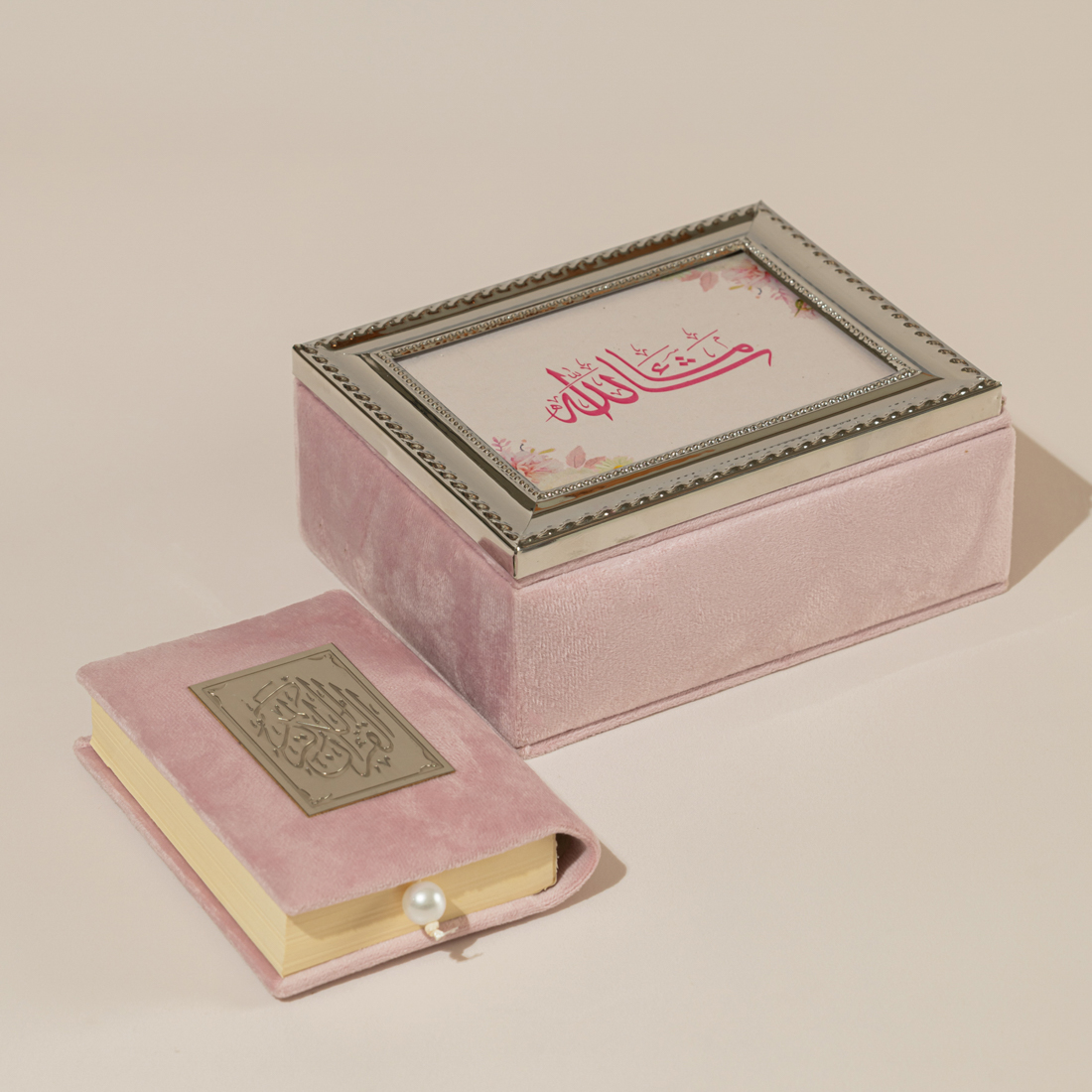 A velvet box topped by a silver frame with a quote, holding the holy Quran in velvet and an engraved name plate