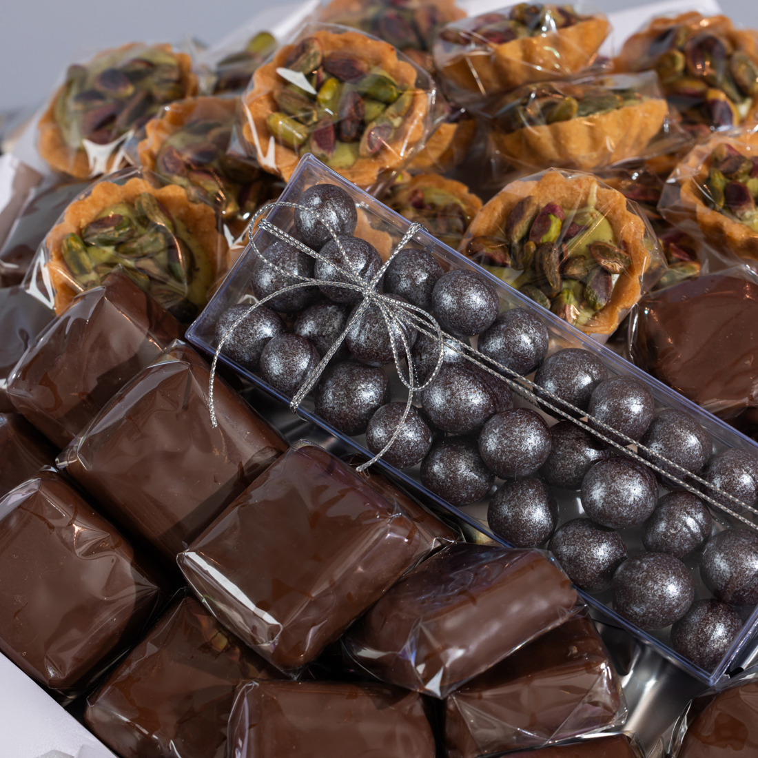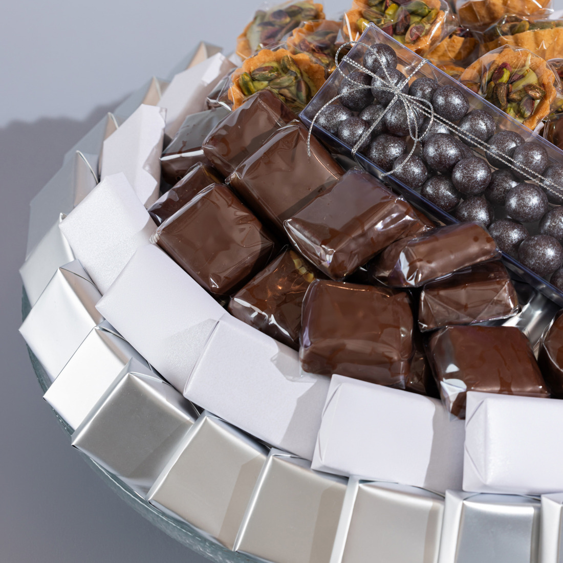 -Crispy balls coated with milk, dark and white chocolate