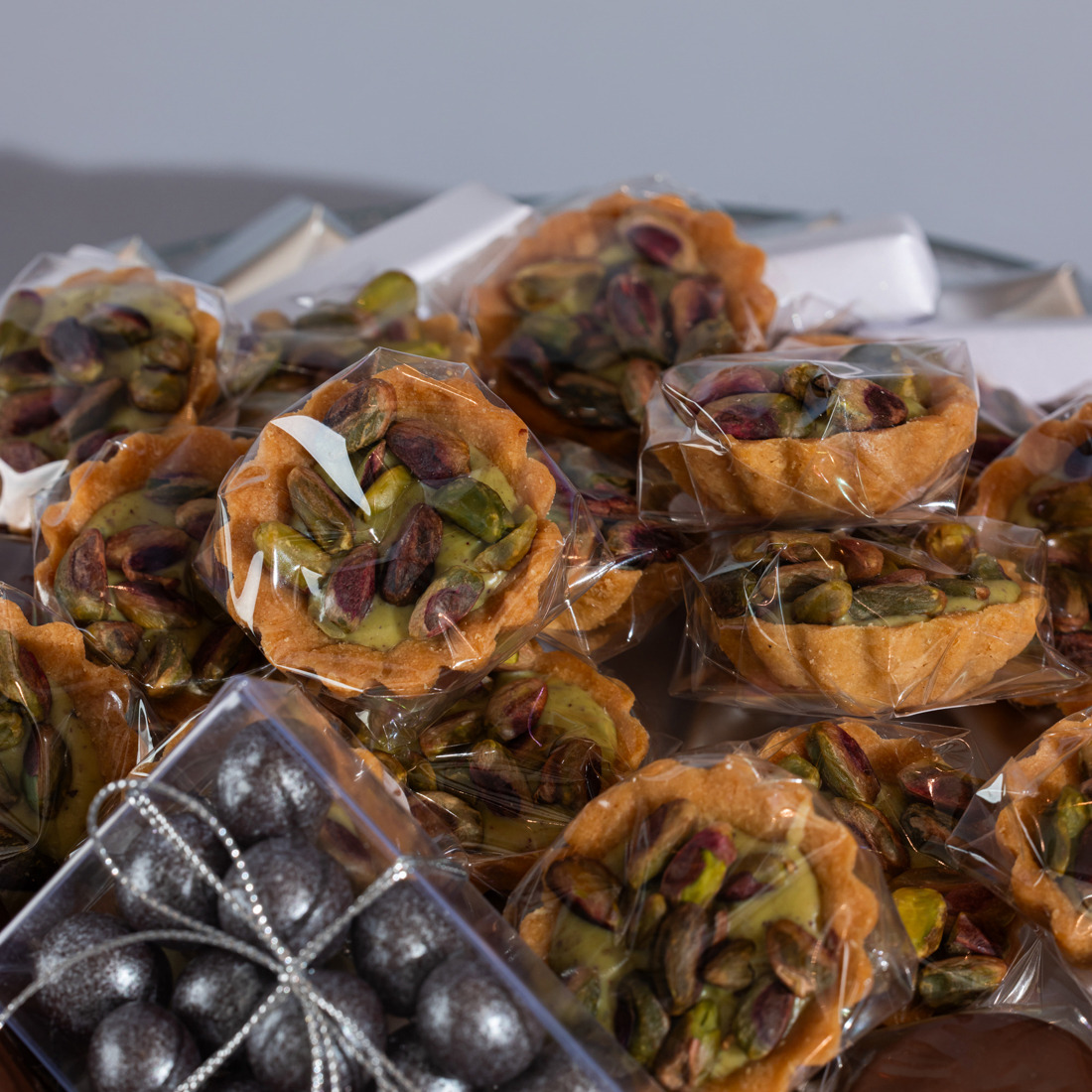A colored glass bowl holding 1600 grams of 100% premium Belgian chocolate, including: