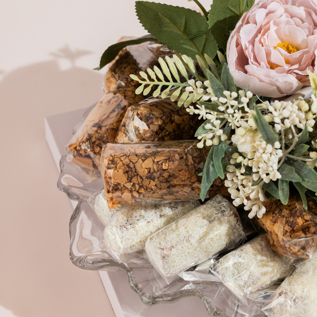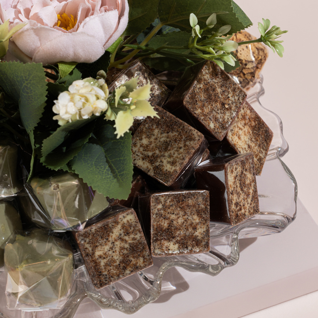 A glass tray holding 570 grams of 100% premium Belgian chocolate, including: