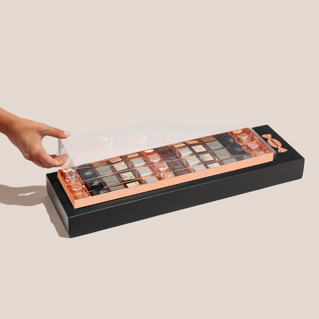 An assorted box holding 36 pieces of 100% premium Belgian milk and dark chocolate.