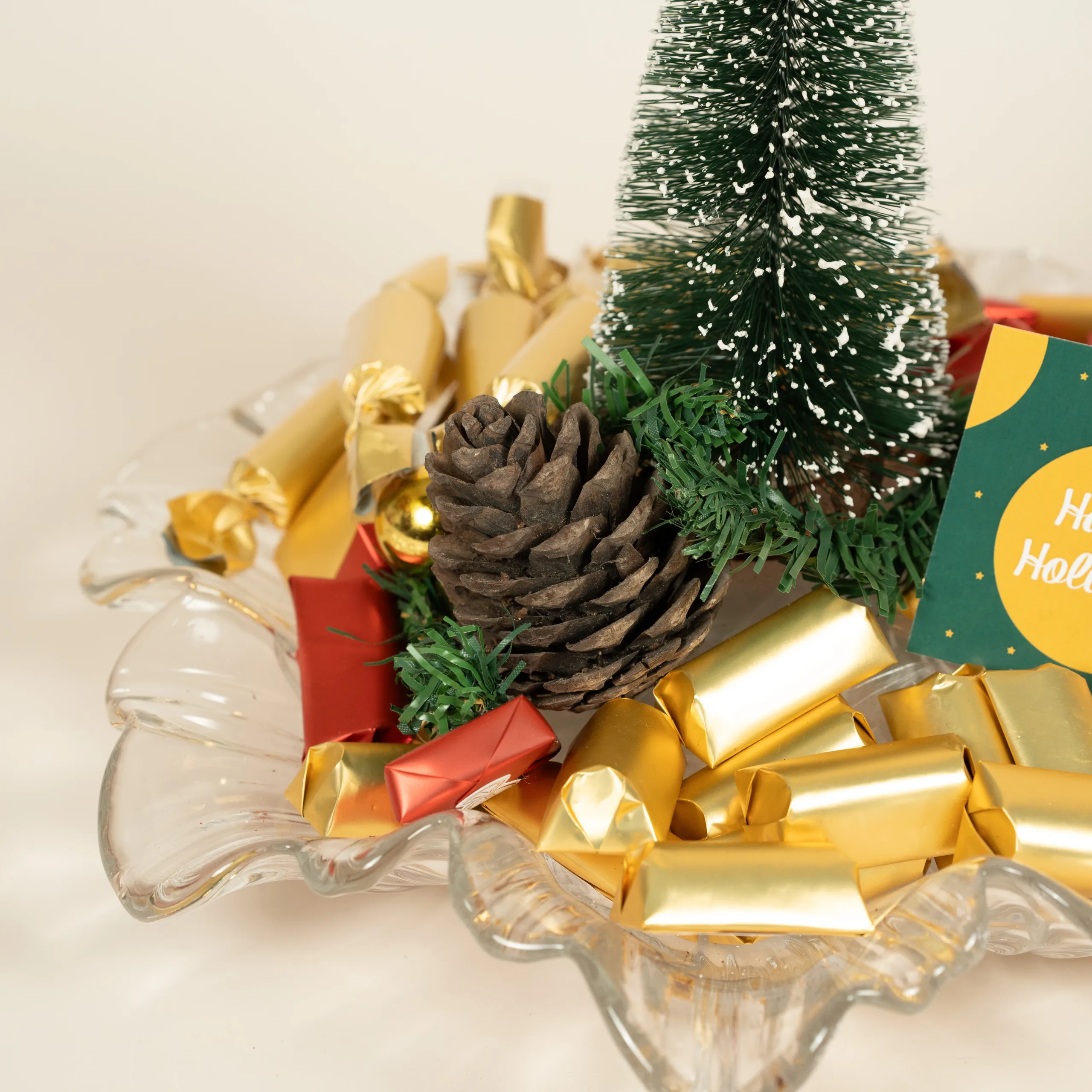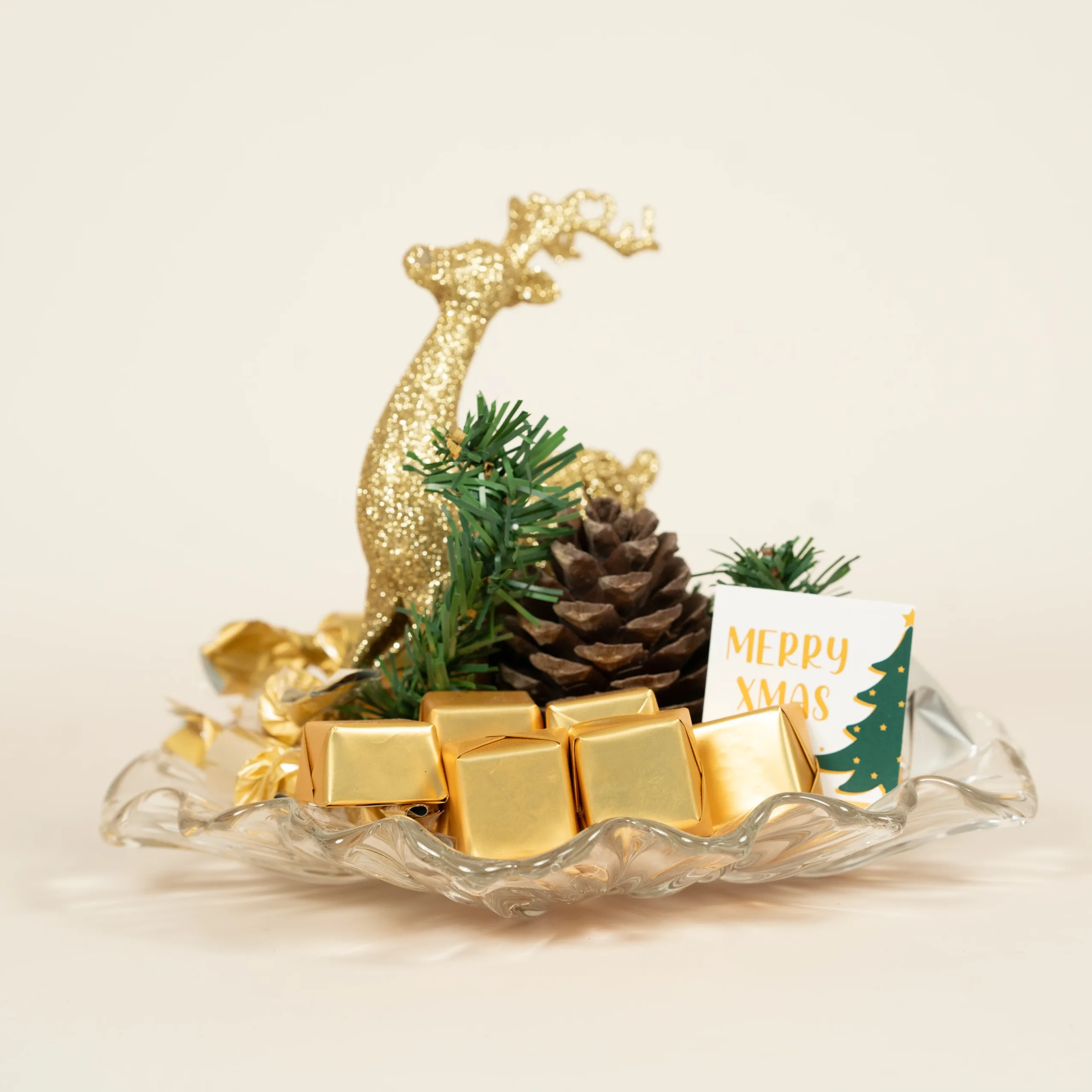 A curvy glass plate filled with 100% premium Belgian chocolate, complemented by Christmas decorations and festive accents.