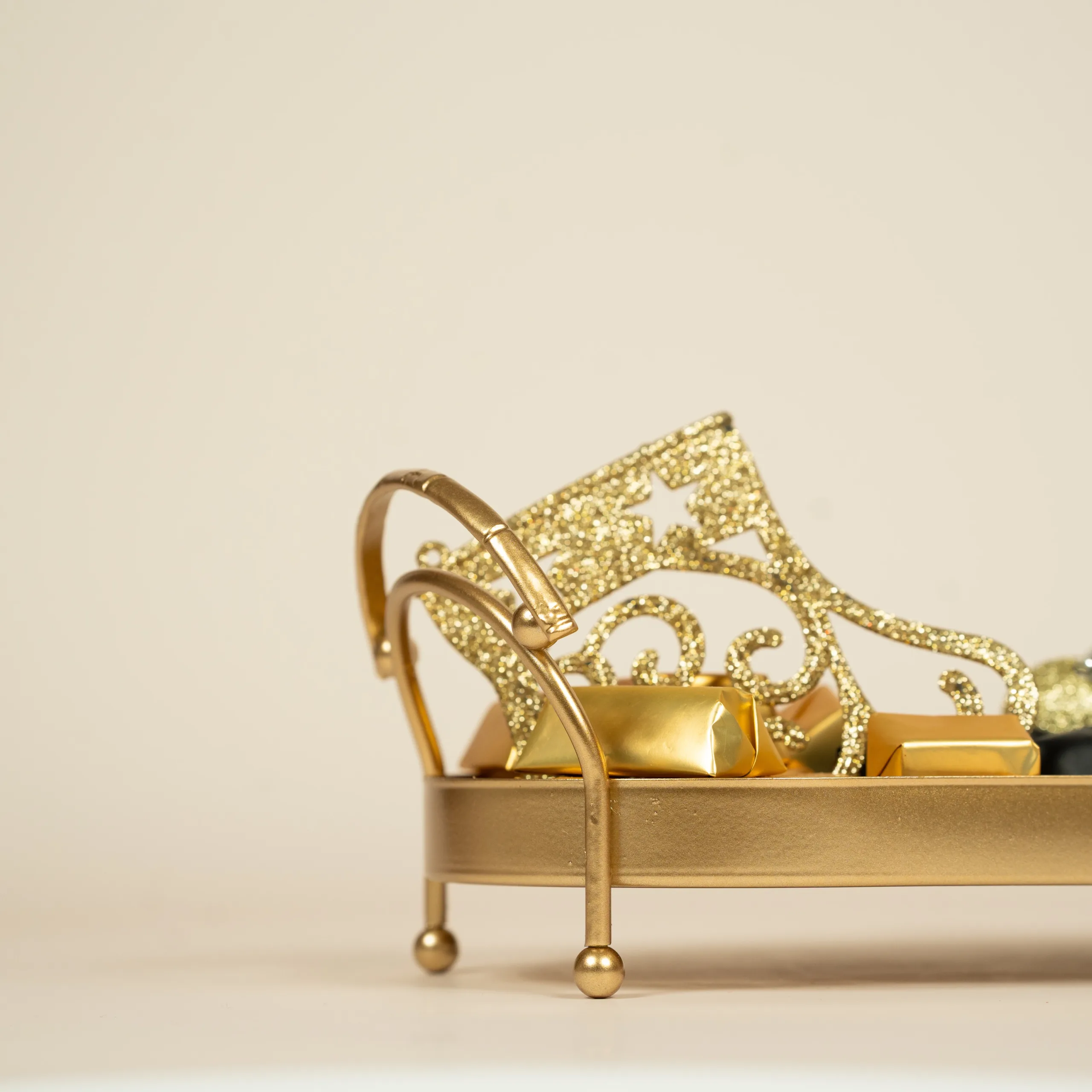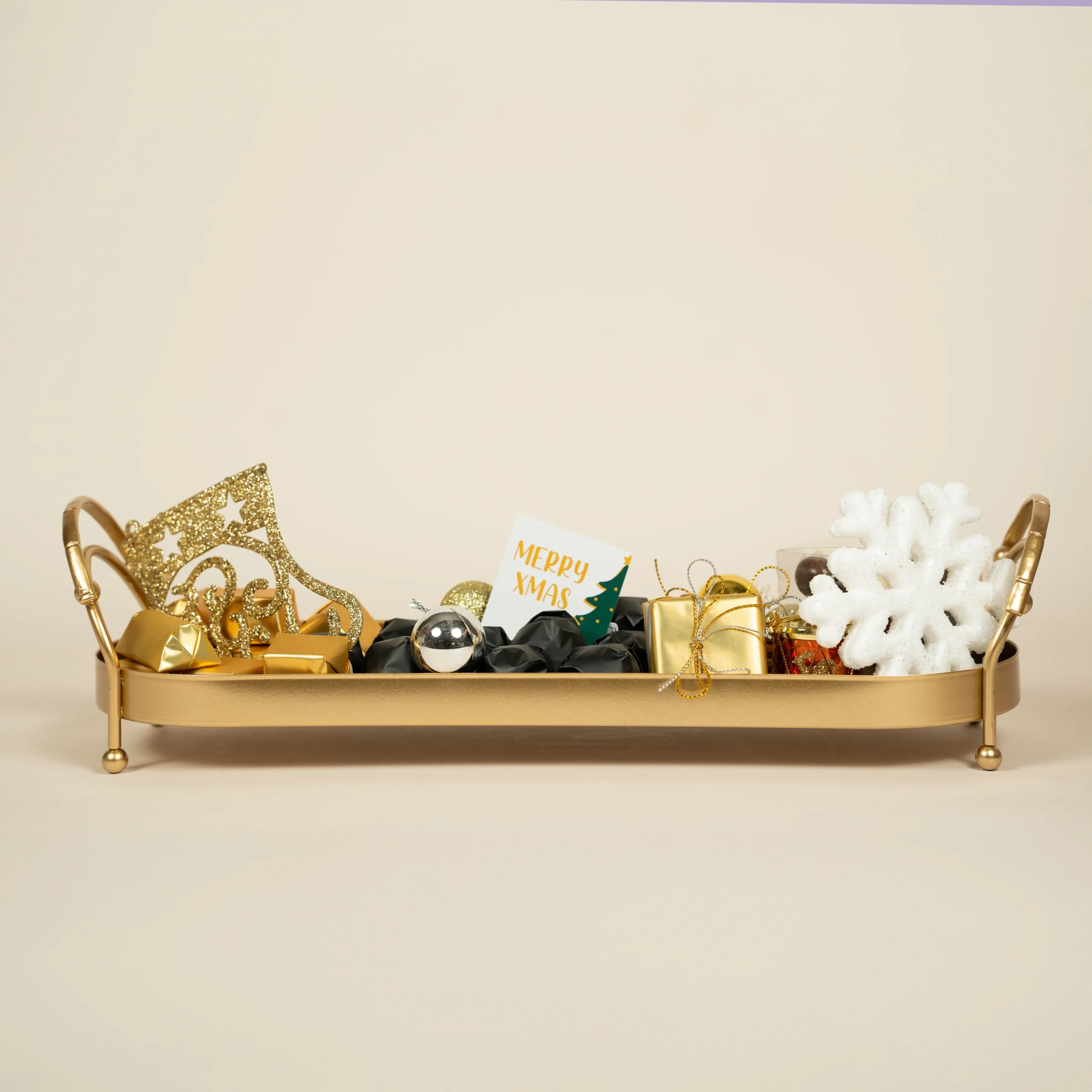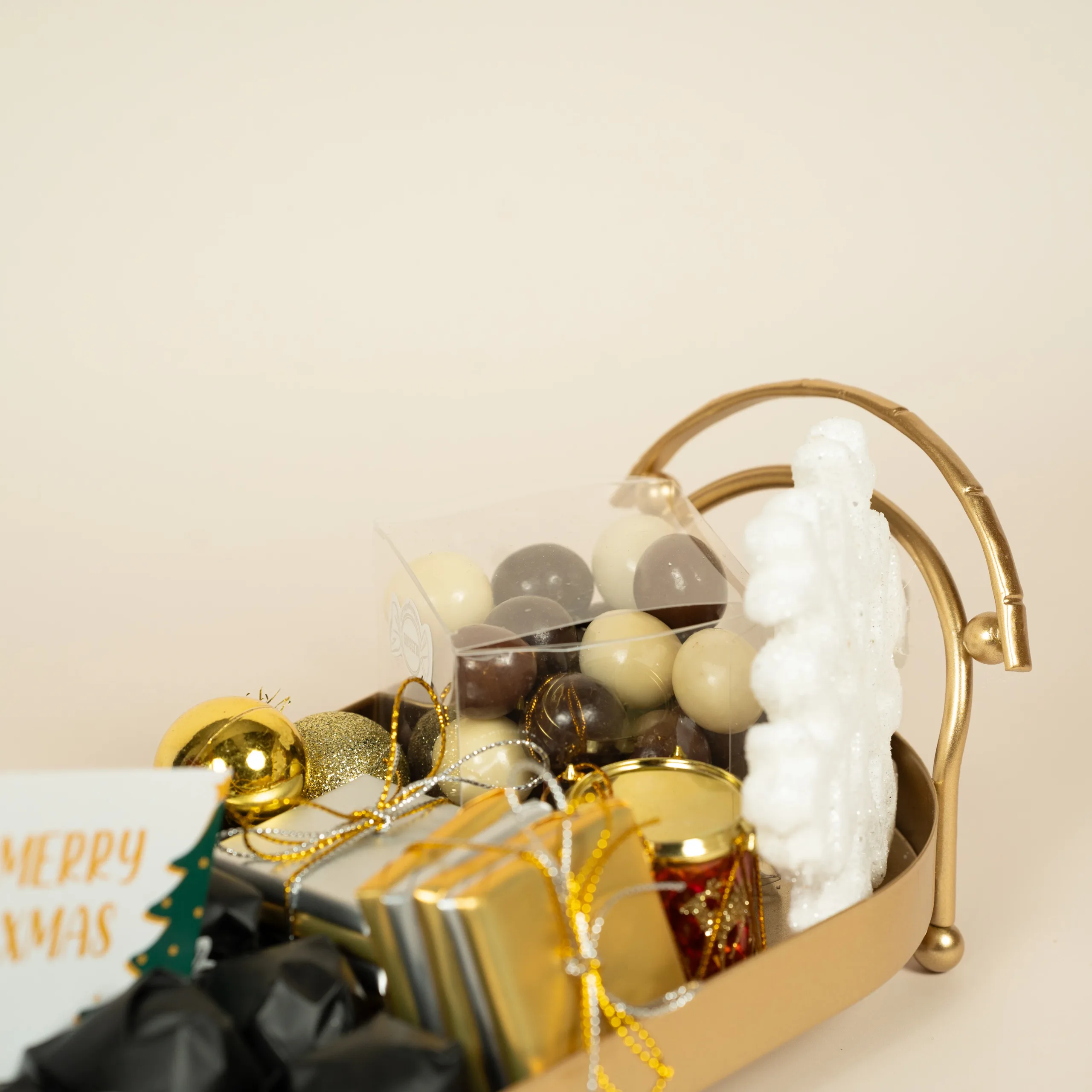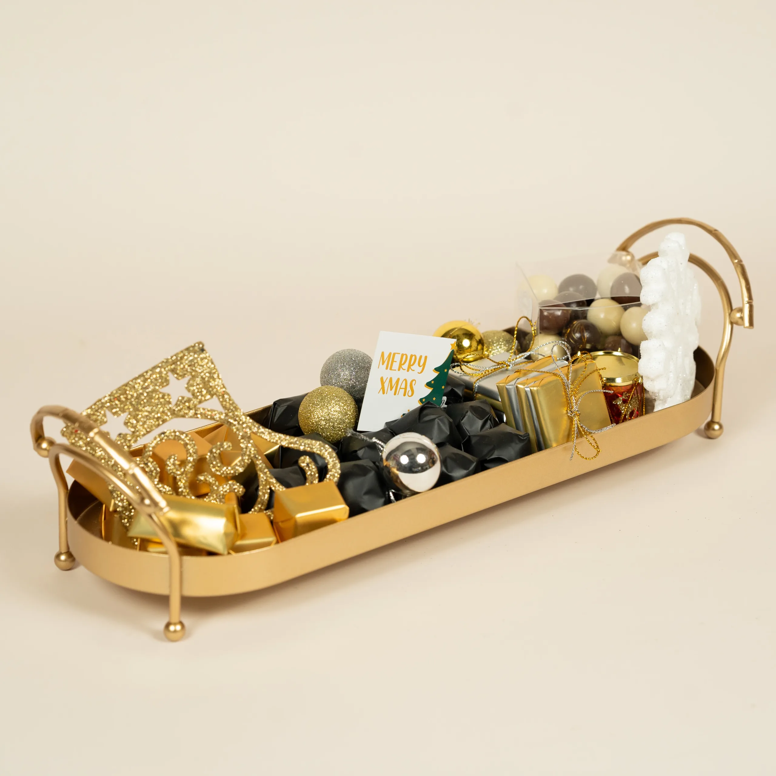 A luxurious gold tray with gold handles featuring 380g of 100% premium Belgian chocolate, paired with festive accents.