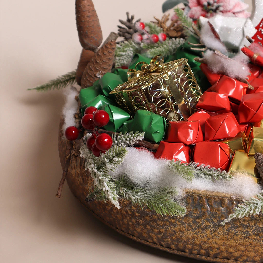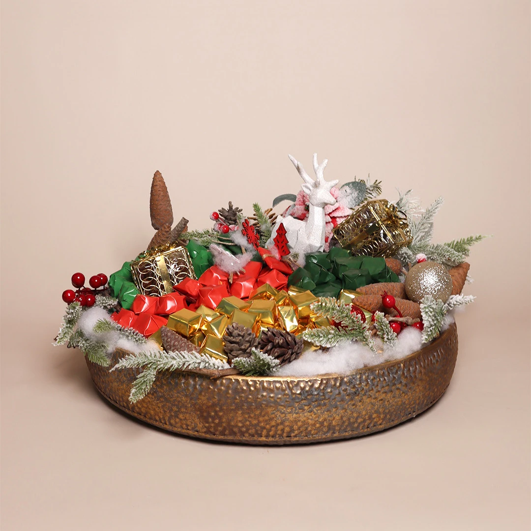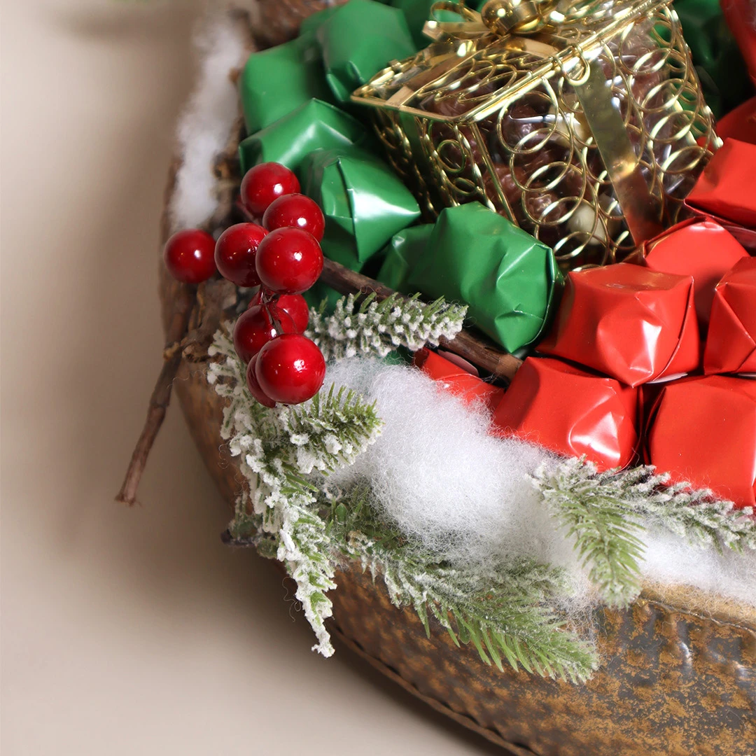 A large, hammered metallic tray holding 3 KG of 100% premium Belgian chocolate, complemented by festive accents, perfect for a grand Christmas celebration.