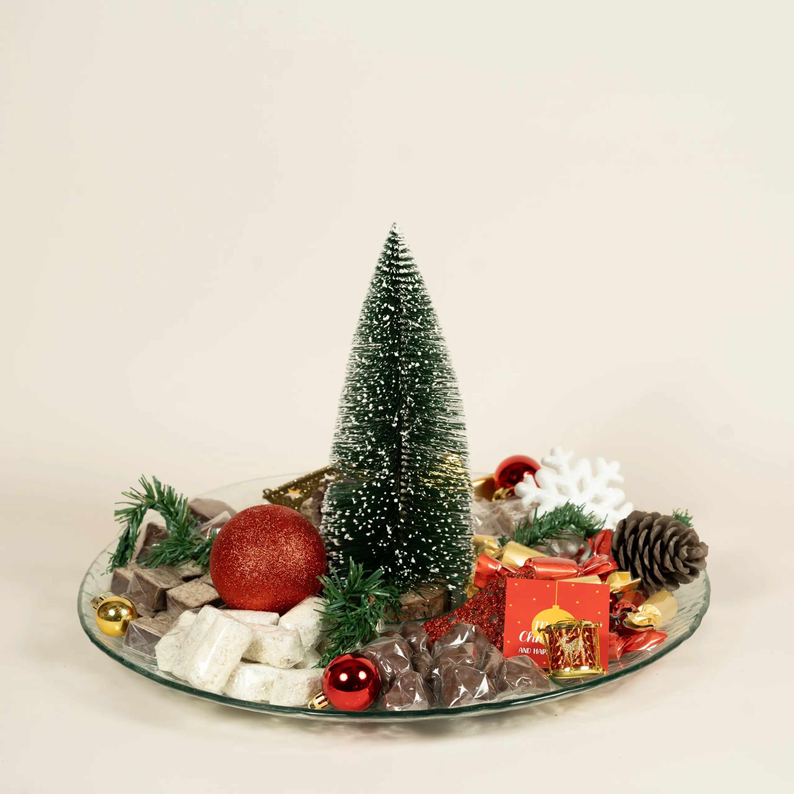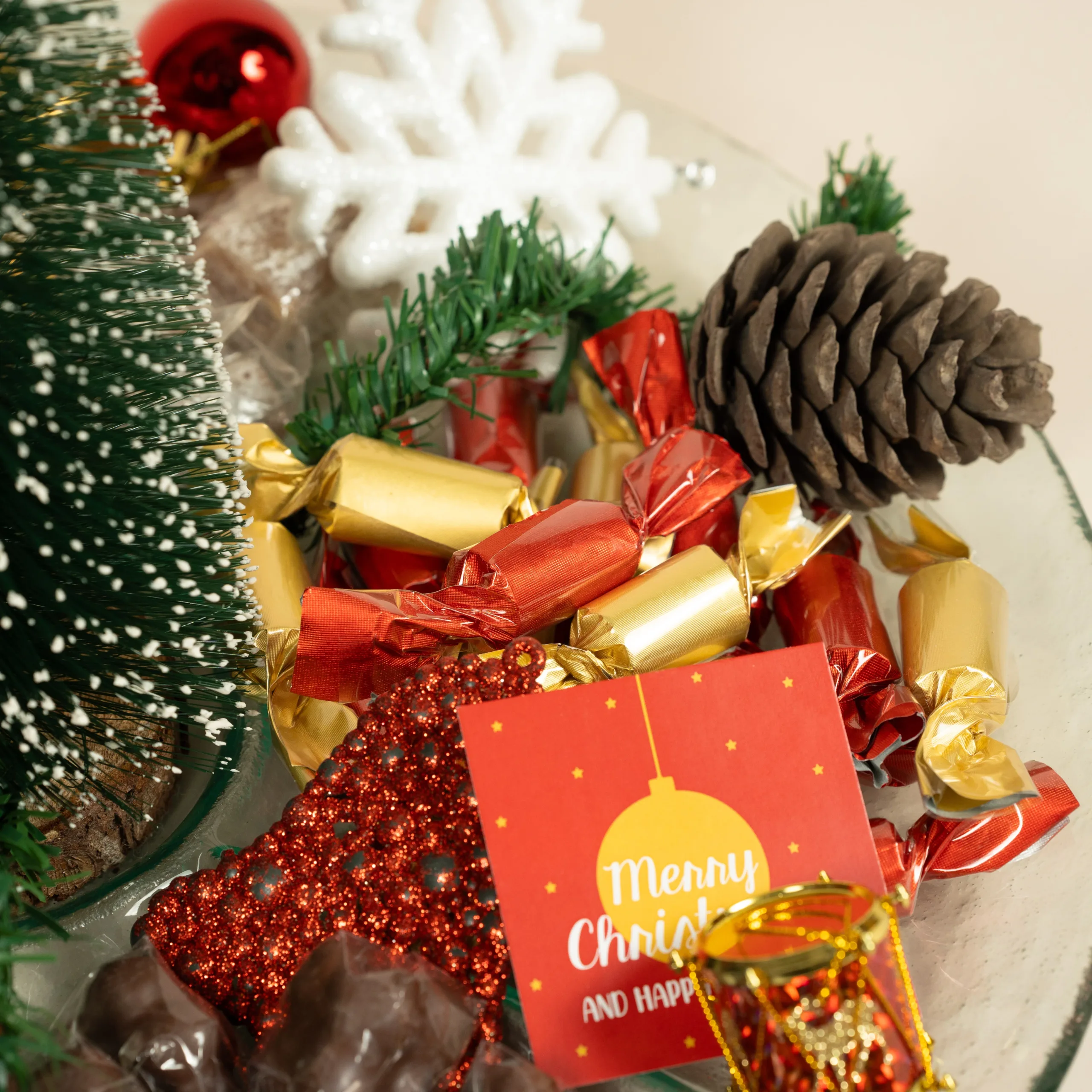 A festive glass platter filled with 1.1 KG of 100% premium Belgian chocolate, complemented by Christmas decorations, perfect for holiday celebrations.