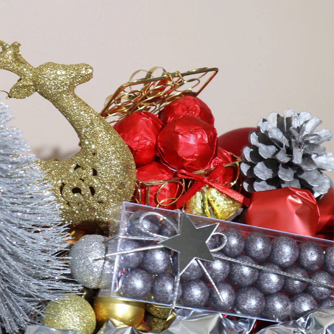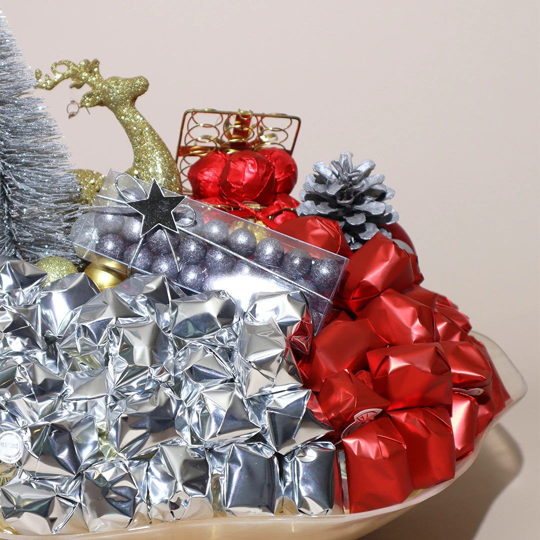 A festive, amber Murano bowl filled with 2 KG of 100% premium Belgian chocolate.