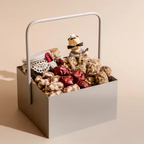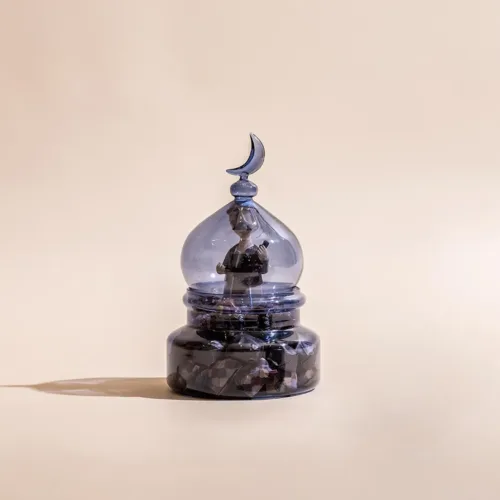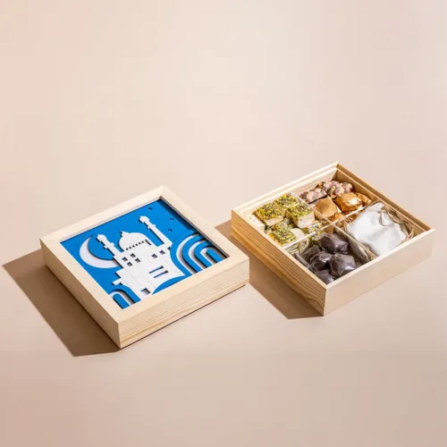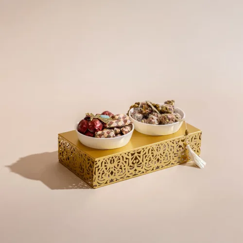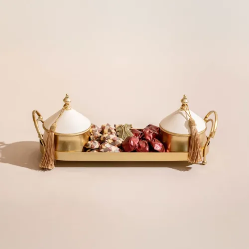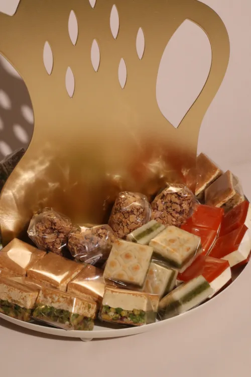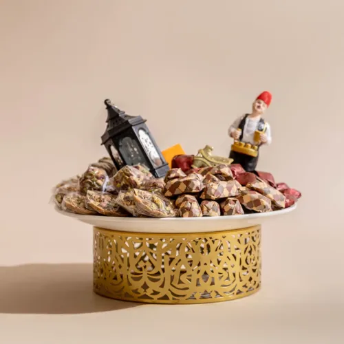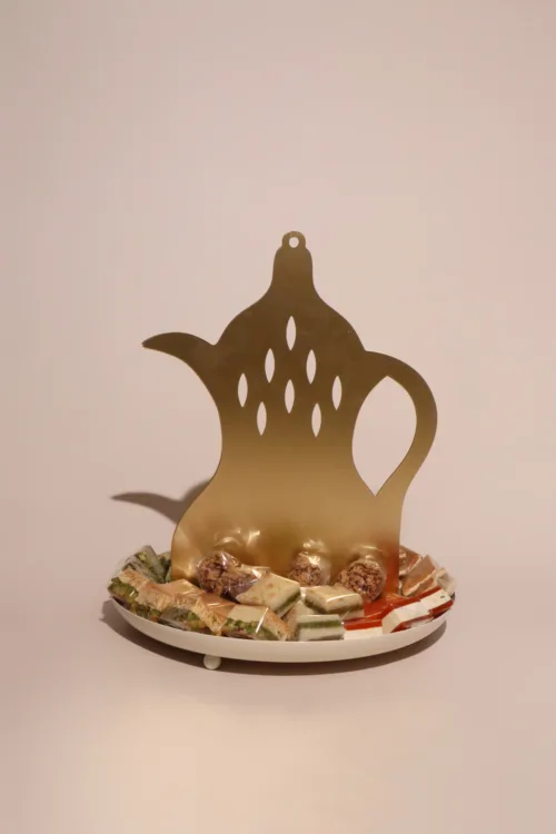 A metallic tray featuring a mosque-inspired incense burner, adorned with a tassel, and filled with 1.2 kilograms of assorted premium Belgian chocolates and oriental sweets