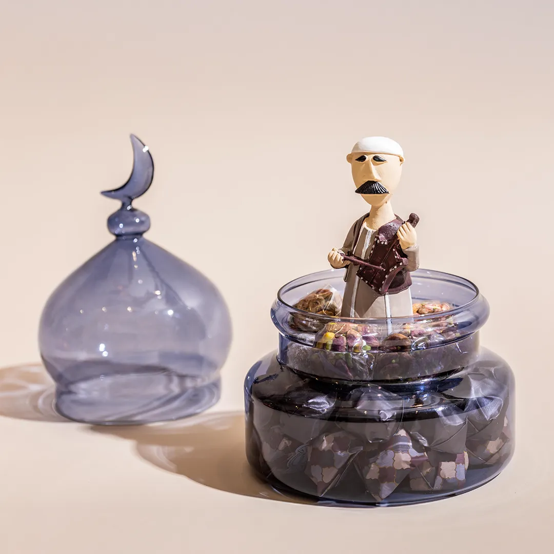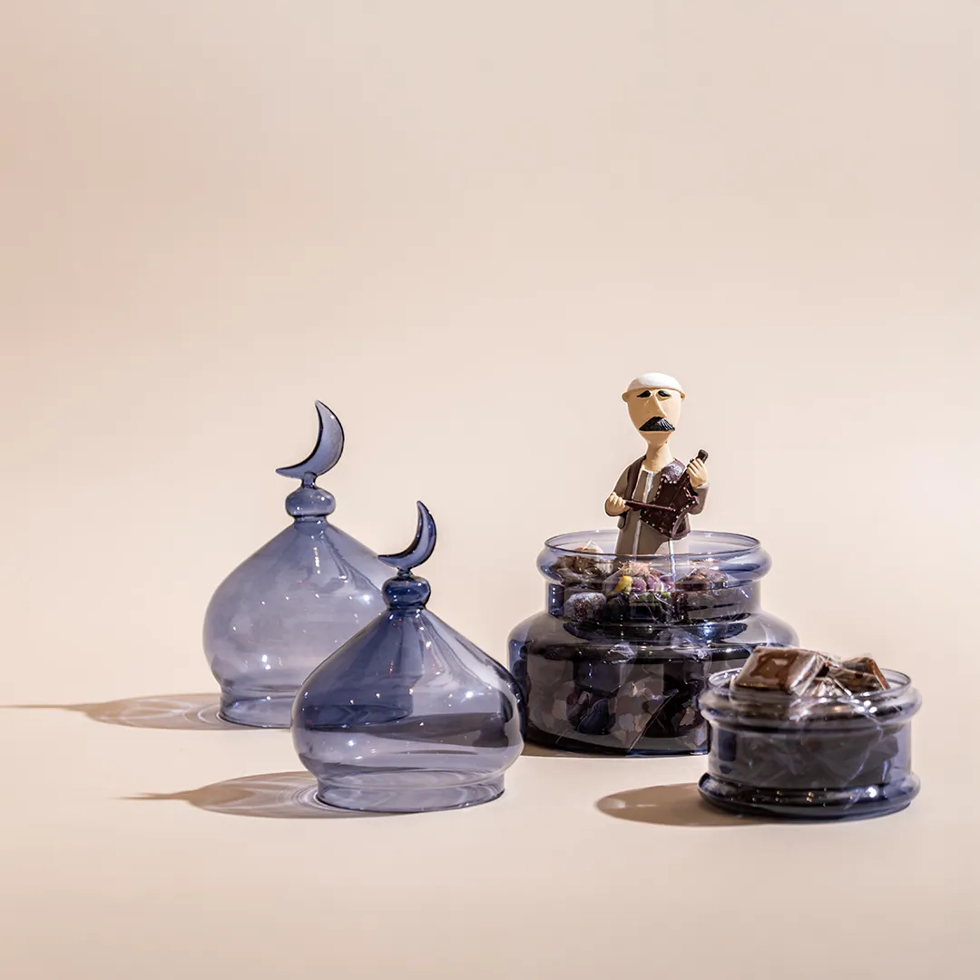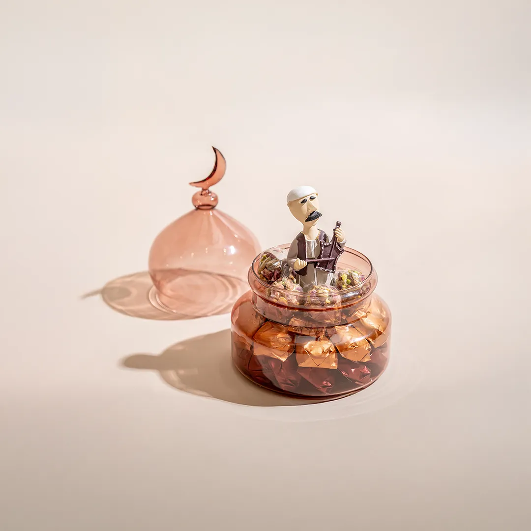 JOD55 – JOD85Price range: JOD55 through JOD85A larger colored glass bonbonniere topped by a crescent, featuring a Ramadan figurine inside, available in red, blue, and green, and filled with 0.65 kg of premium Belgian chocolates and oriental sweets -