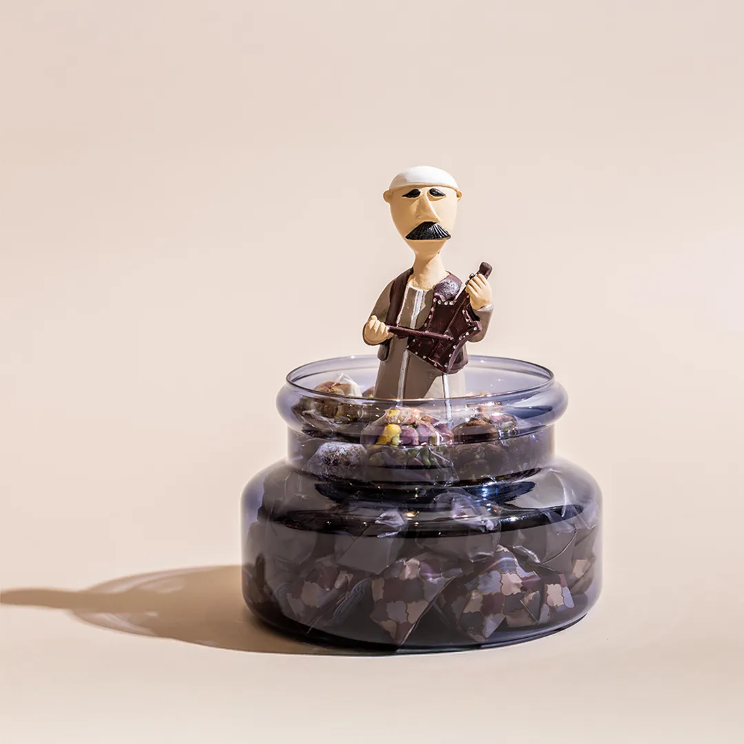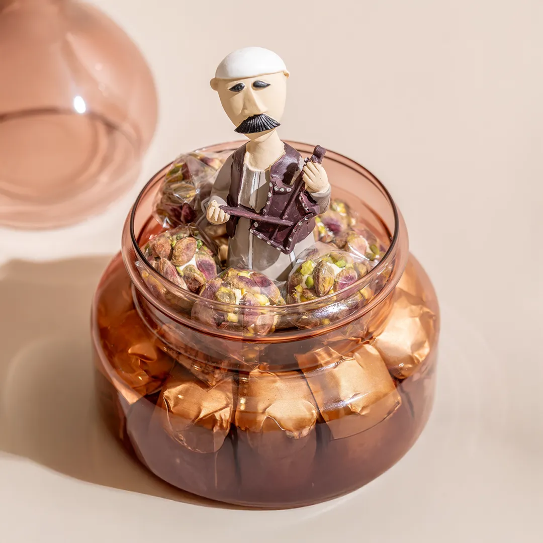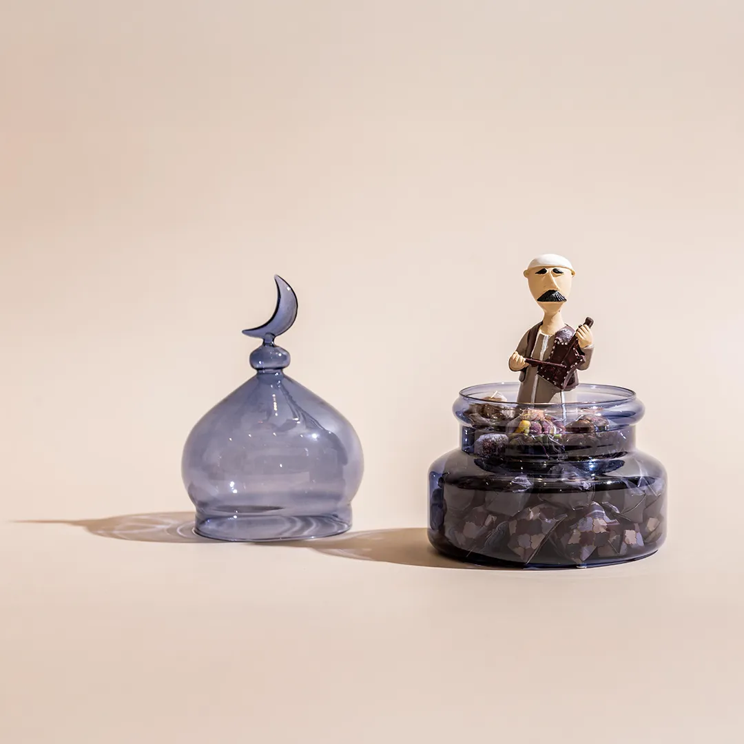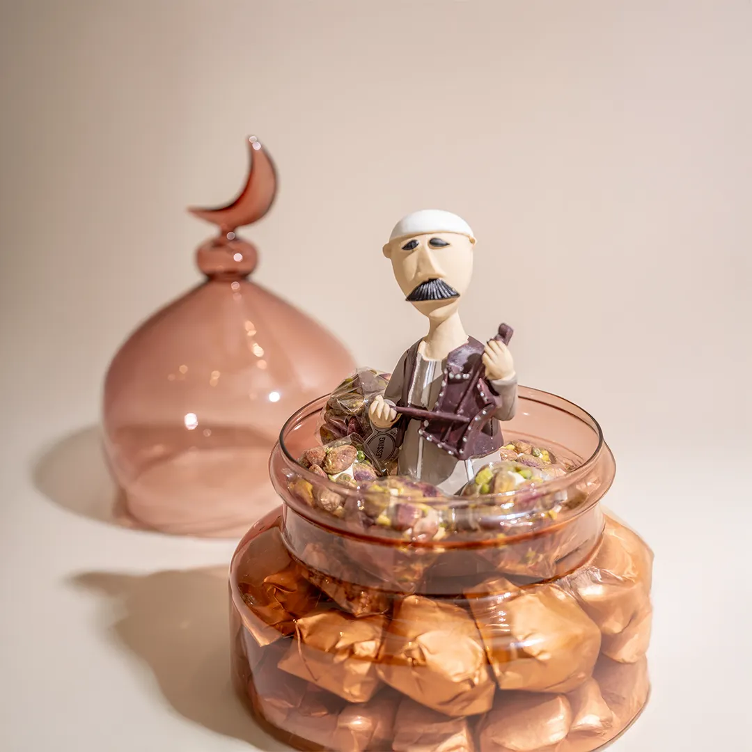 JOD55 – JOD85Price range: JOD55 through JOD85A larger colored glass bonbonniere topped by a crescent, featuring a Ramadan figurine inside, available in red, blue, and green, and filled with 0.65 kg of premium Belgian chocolates and oriental sweets -