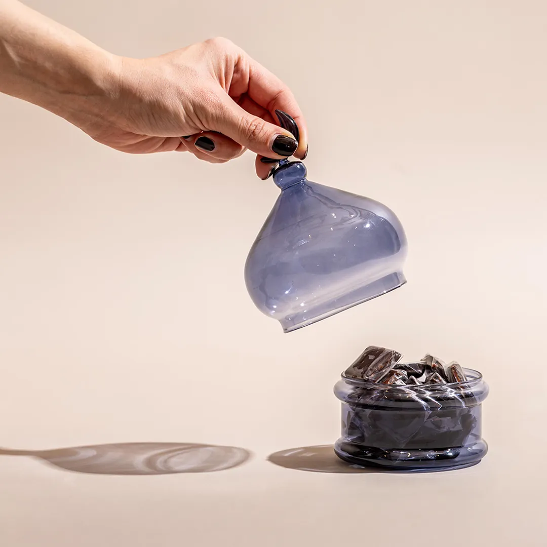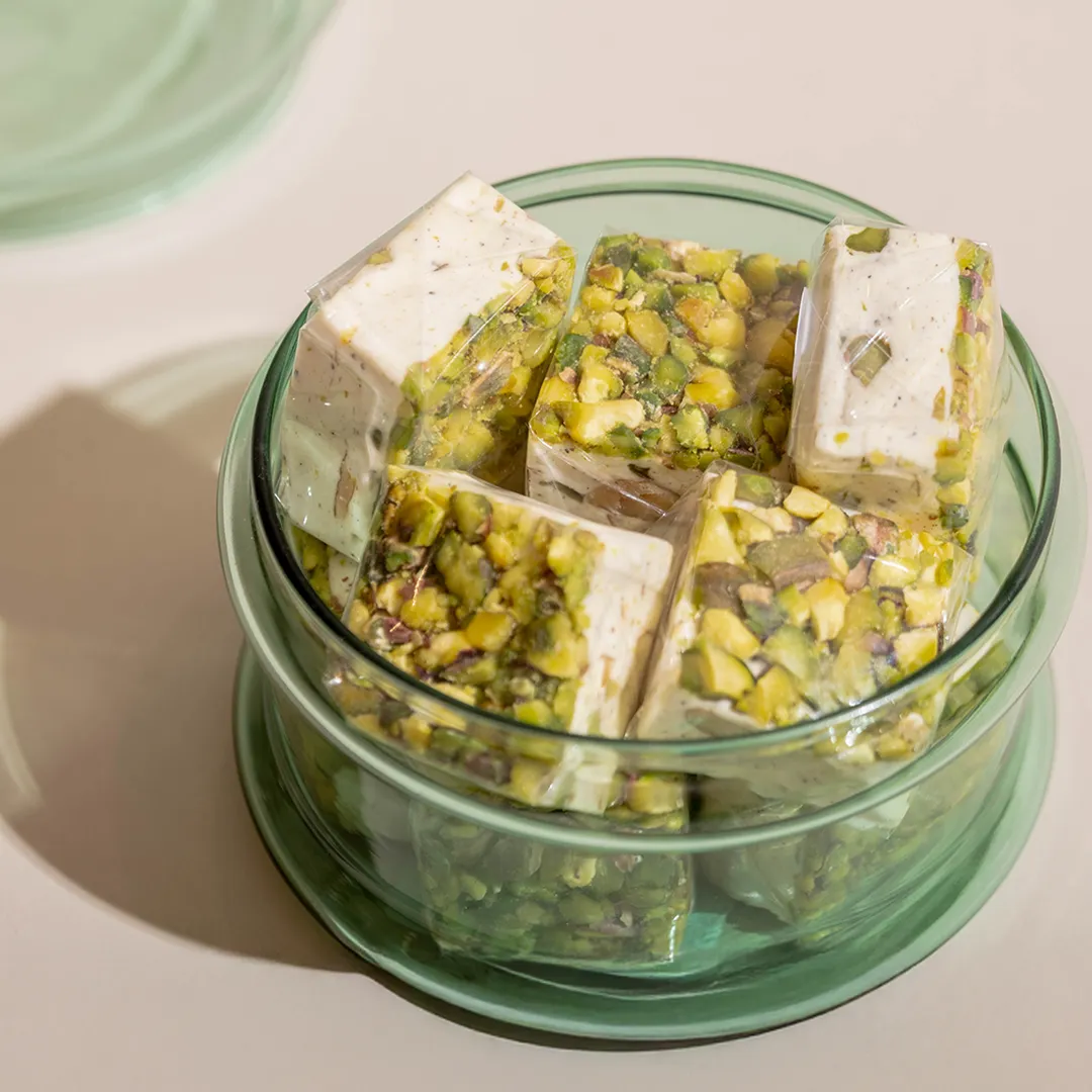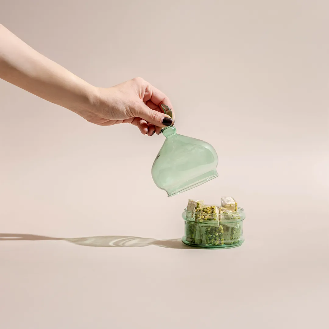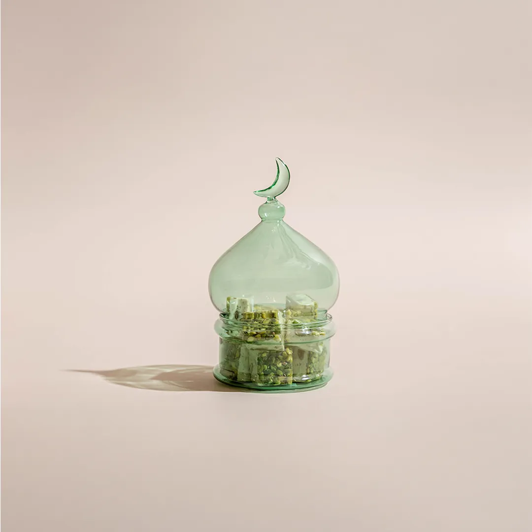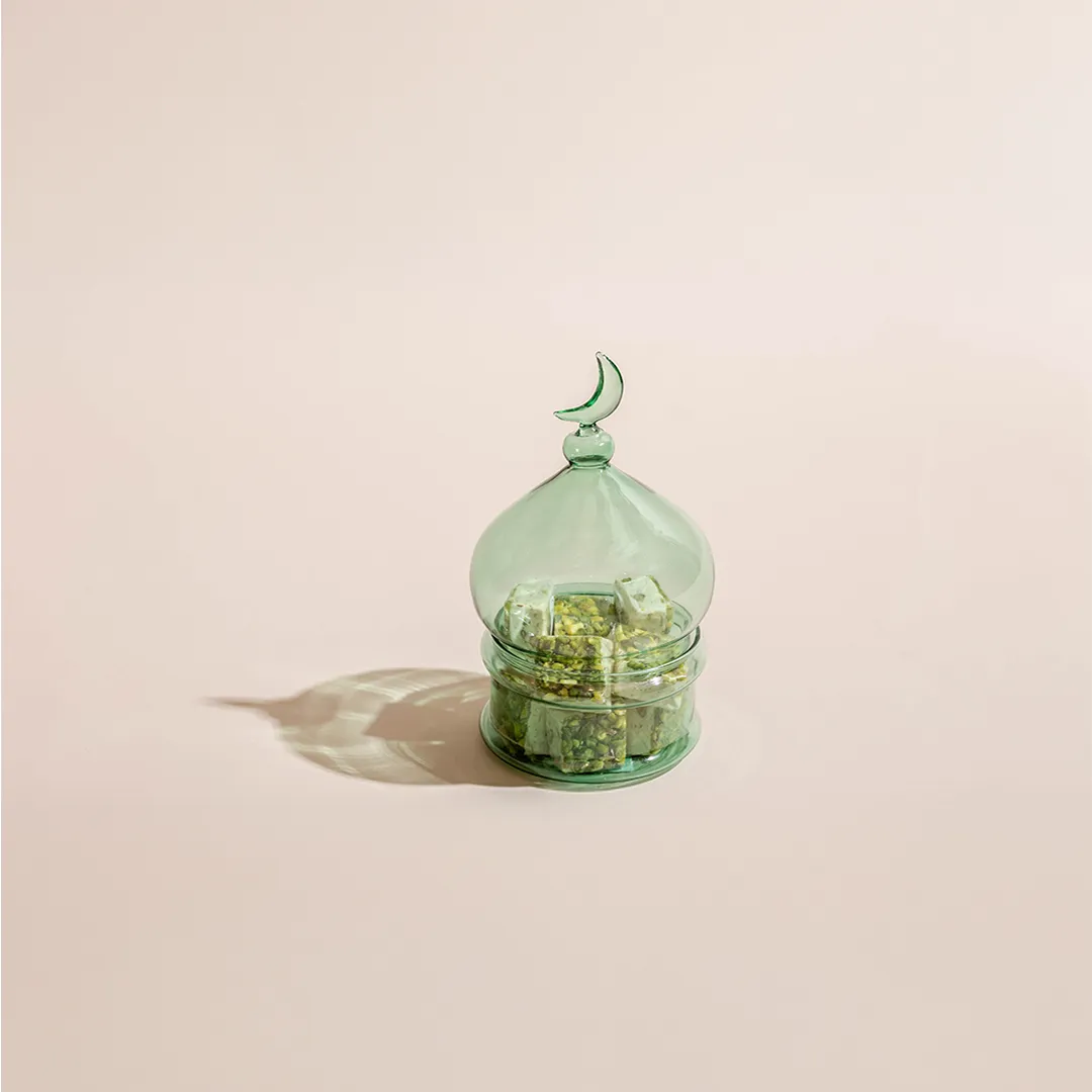 JOD35 – JOD90Price range: JOD35 through JOD90A pistache opaque glass bonbonnière with a lid featuring a crescent handle, available in two sizes and filled with 0.5 kg and 0.9 kg of premium Belgian chocolates and oriental sweets. -