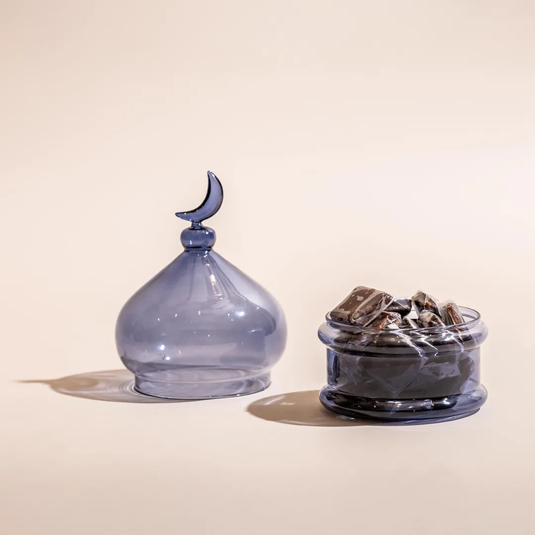 A small, colored glass bonbonniere topped by a crescent, available in red, blue, and green, and filled with 0.2 kg of premium Belgian chocolates and oriental sweets