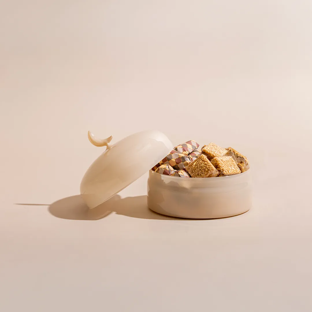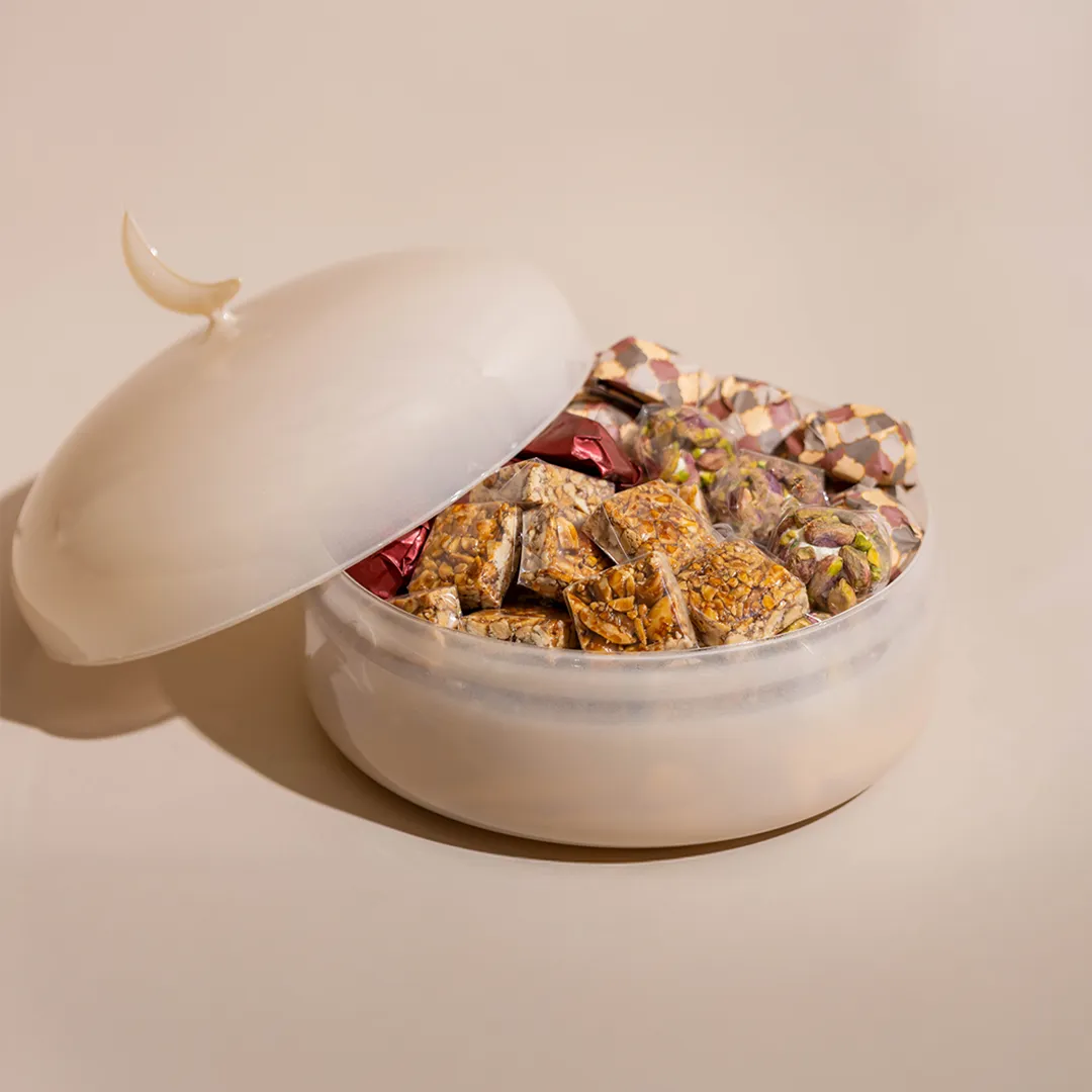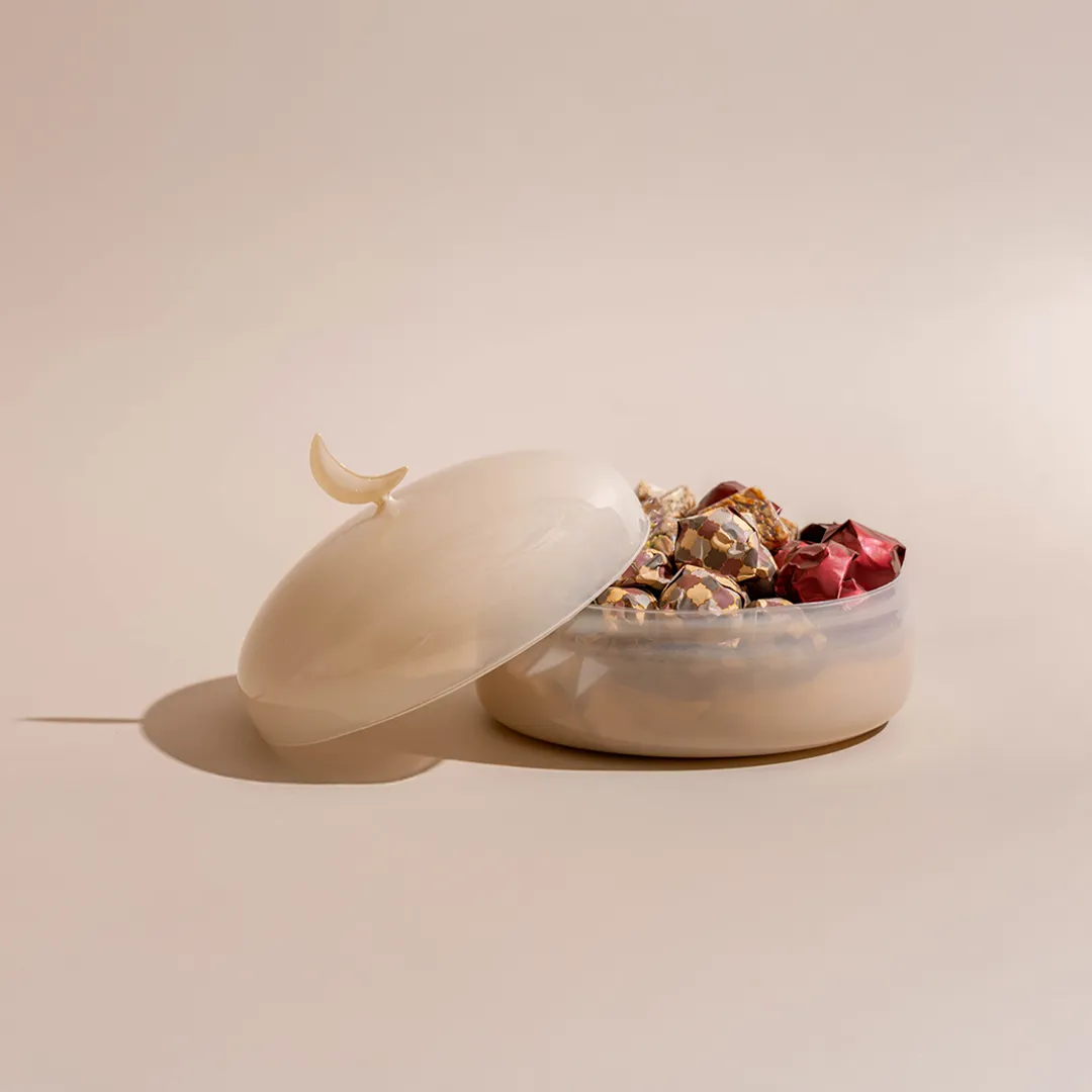 An ivory opaque glass bonbonnière with a lid featuring a crescent handle, available in two sizes and filled with 0.5 kg and 0.9 kg of premium Belgian chocolates and oriental sweets.