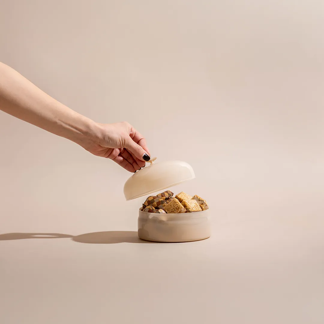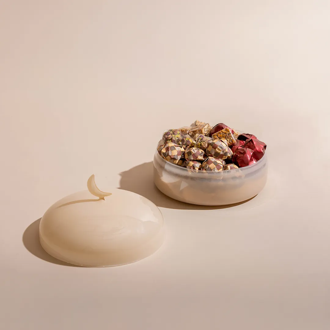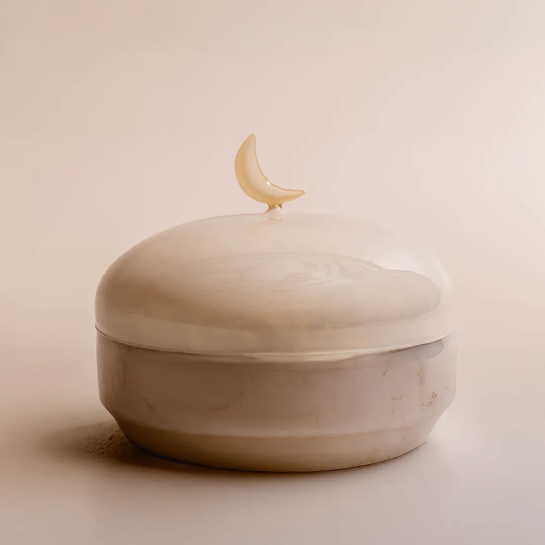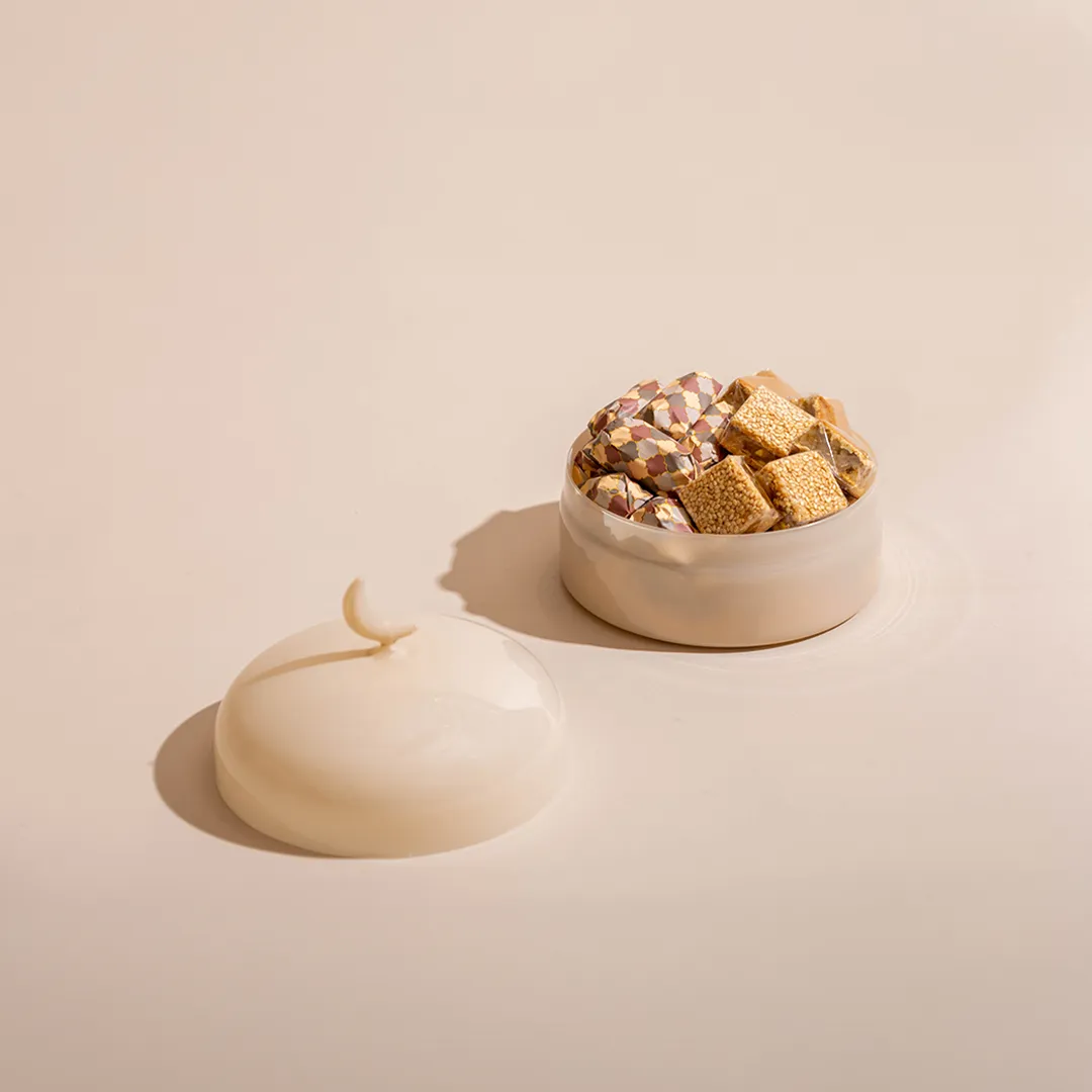 An ivory opaque glass bonbonnière with a lid featuring a crescent handle, available in two sizes and filled with 0.5 kg and 0.9 kg of premium Belgian chocolates and oriental sweets.