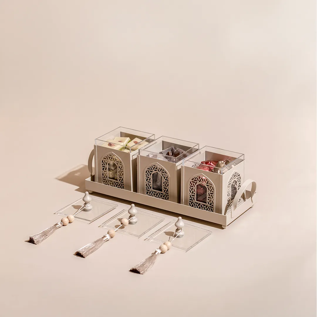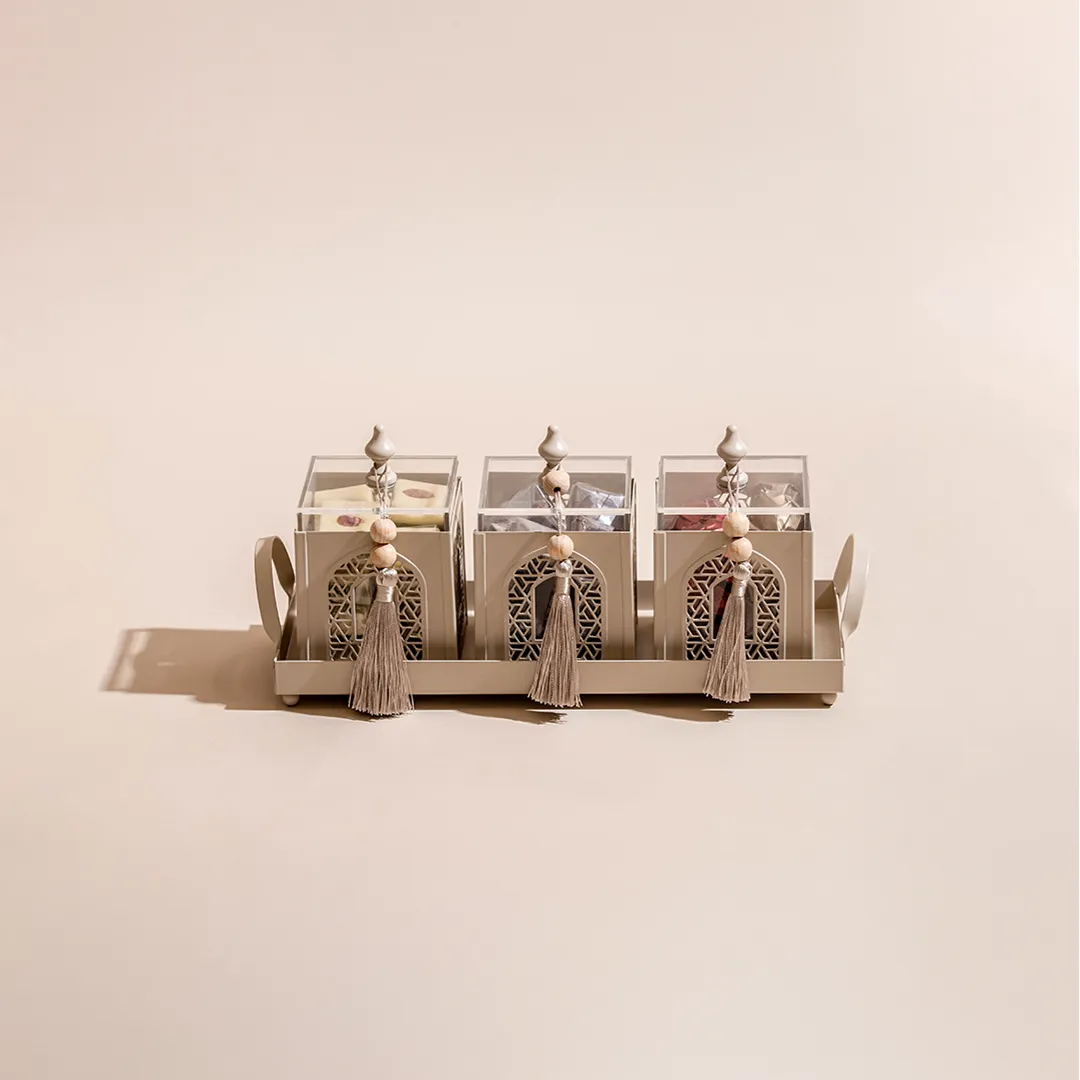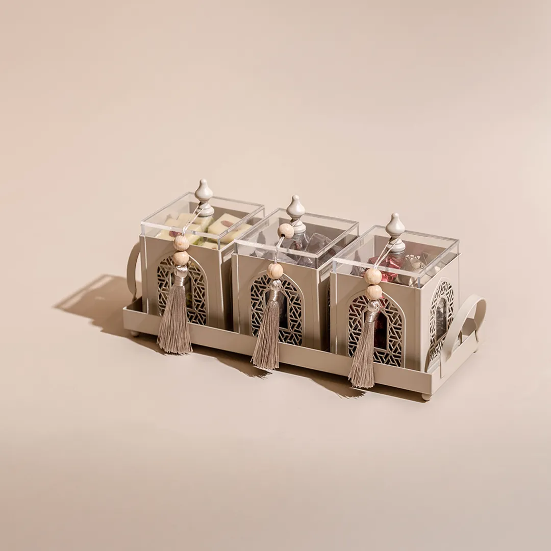A metallic tray featuring a set of three arabesque boxes, adorned with beads matching and tassels, holding 850 grams of assorted premium Belgian chocolate and oriental sweets