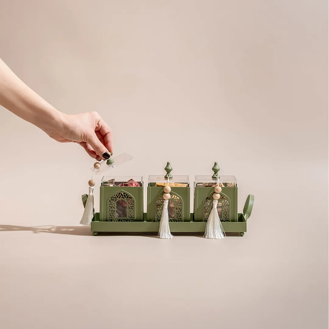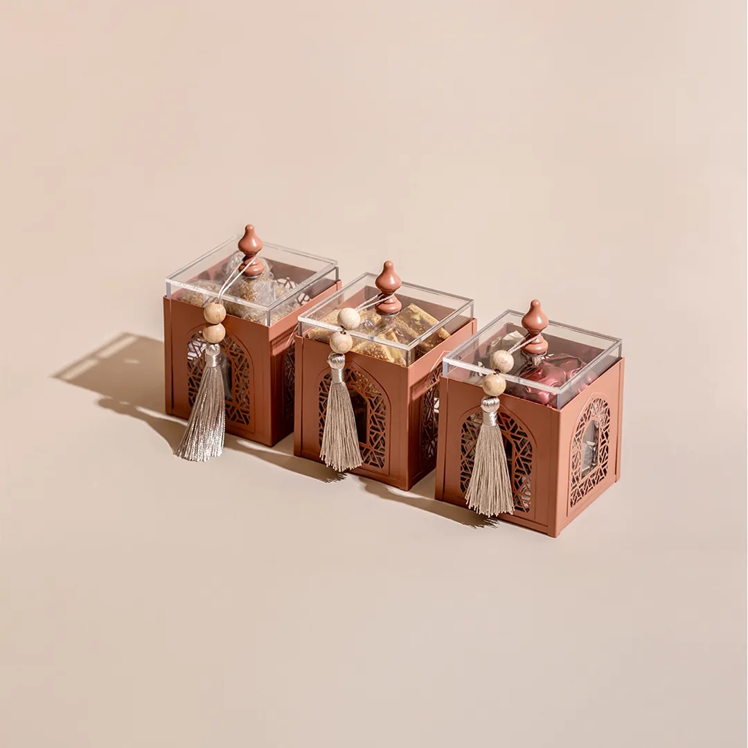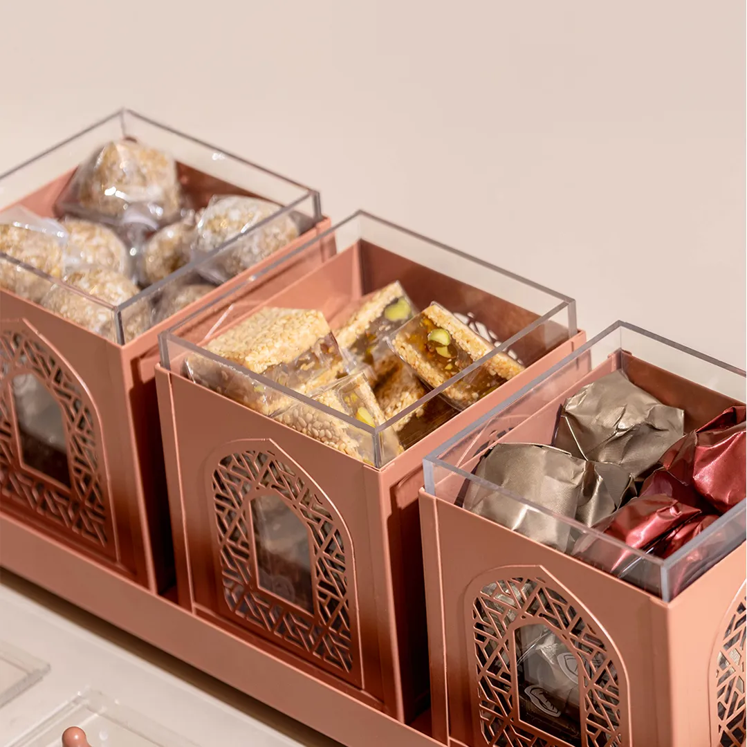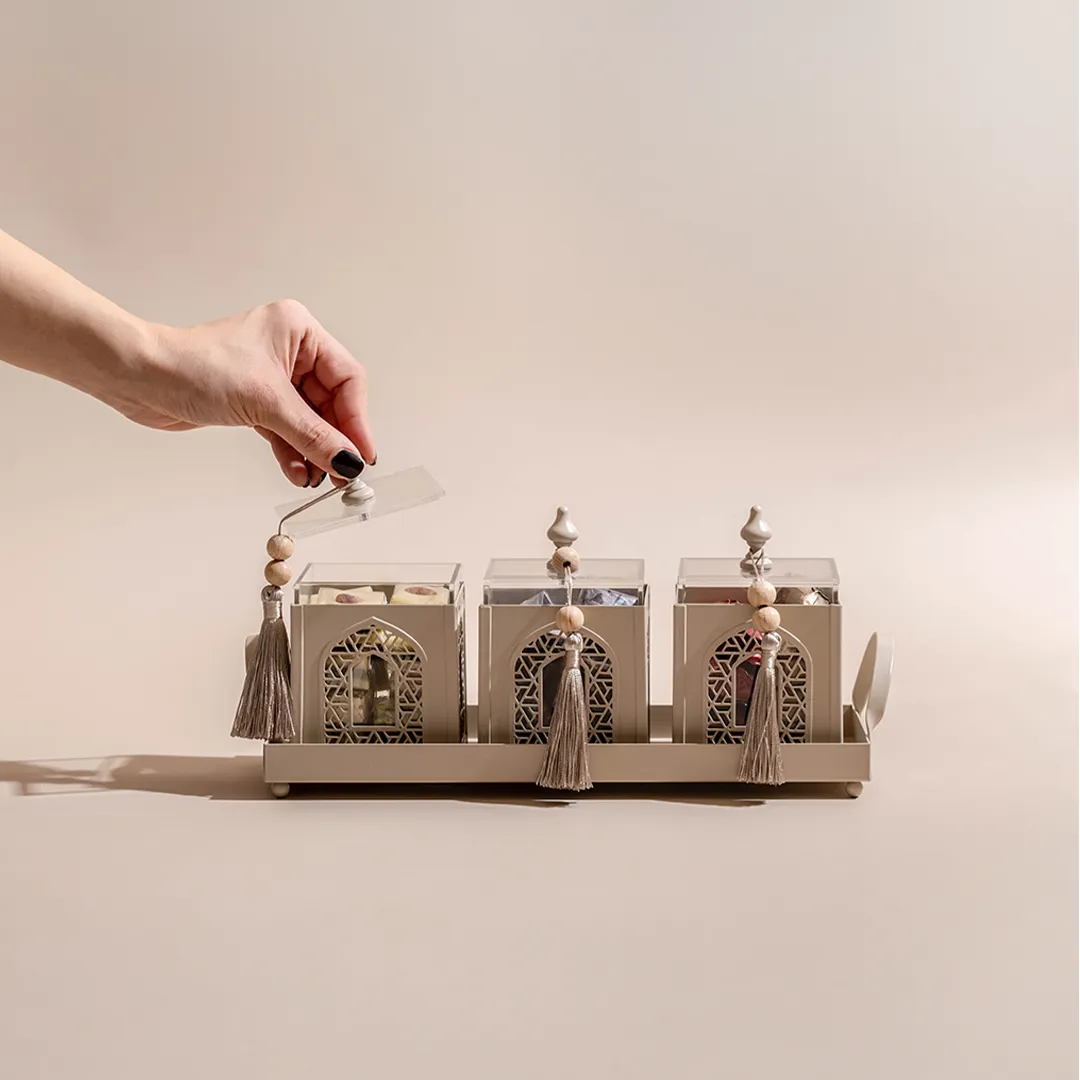 A metallic tray featuring a set of three arabesque boxes, adorned with beads matching and tassels, holding 850 grams of assorted premium Belgian chocolate and oriental sweets
