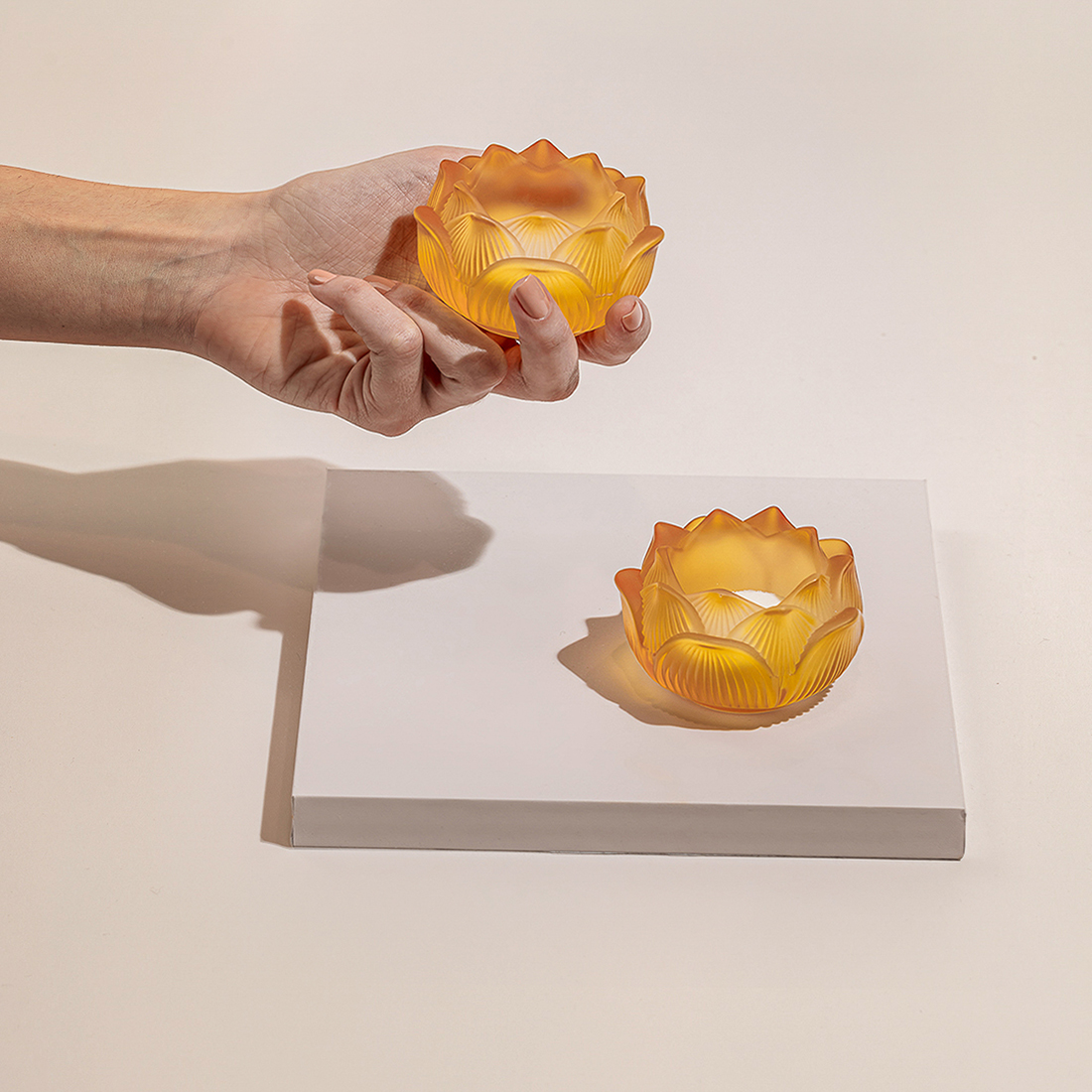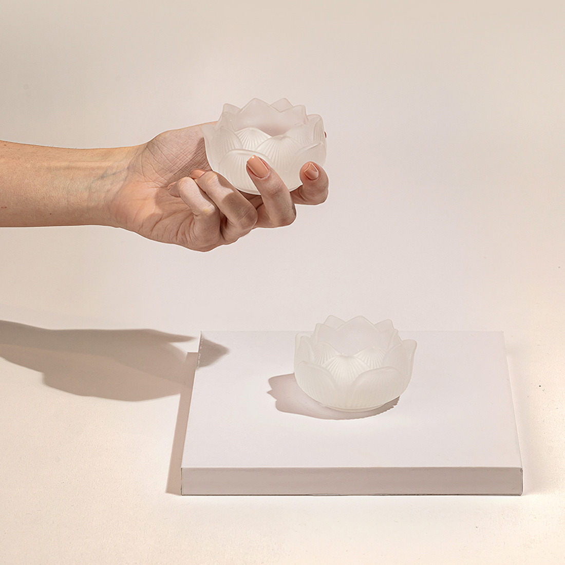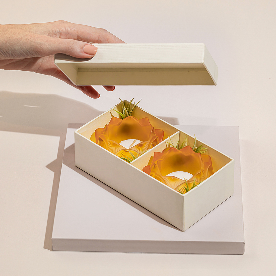 A set of two frosted, flower-shaped glass candles in a decorated gift box.