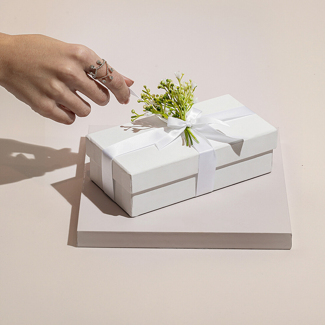 JOD55A gift set including the holy Quran with an engraved name plate, pearl worry beads with Ayat Al Kursi engraved, two personalized pieces of chocolate, and a box of sugared almonds - in a customized gift box. -