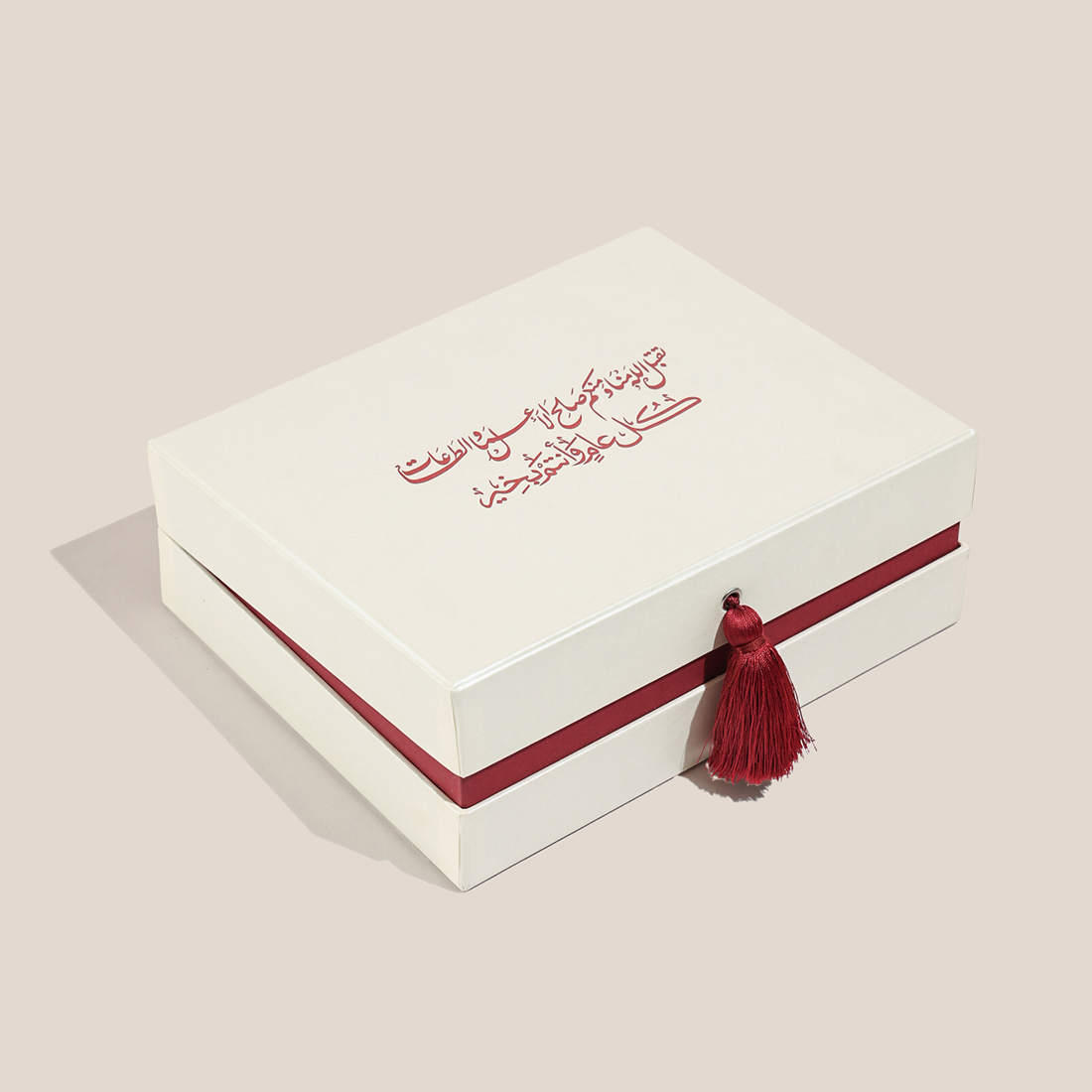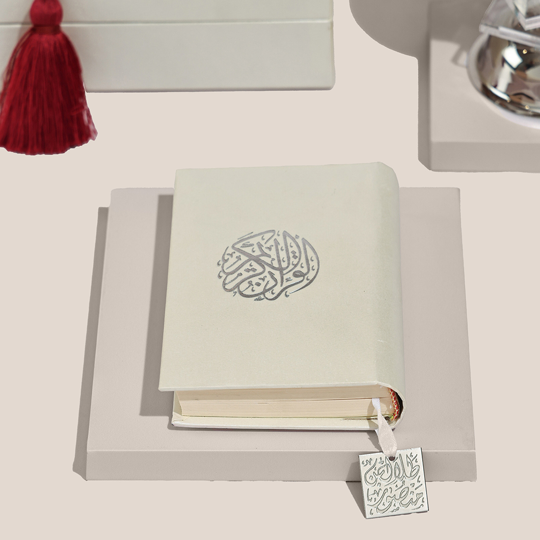 JOD55A gift set including the holy Quran with an engraved name plate, pearl worry beads with Ayat Al Kursi engraved, two personalized pieces of chocolate, and a box of sugared almonds - in a customized gift box. -