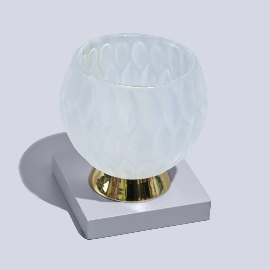 JOD28A white glass candle with a lid in a see-through, decorated box. -