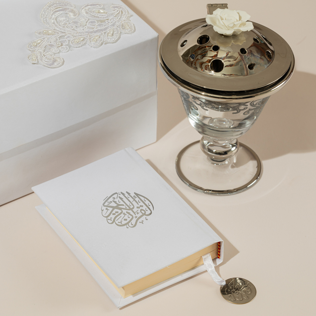 A gift set including a large crystal incense burner and the holy Quran with an engraved name plate – all in a decorated gift box