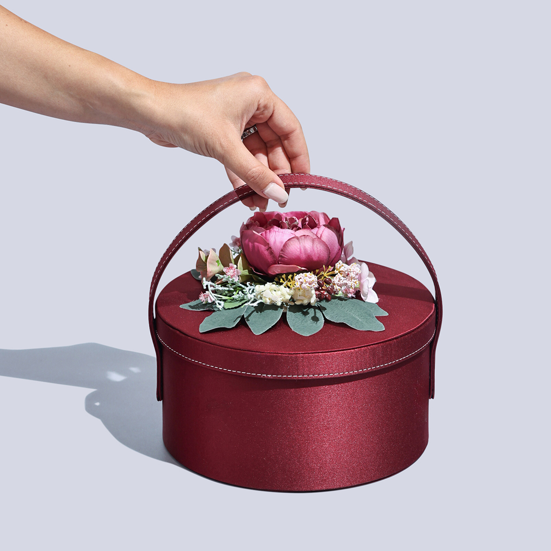 JOD75A silver bonbonniere with a floral handle, presented in a decorated box with an engraved nameplate. -