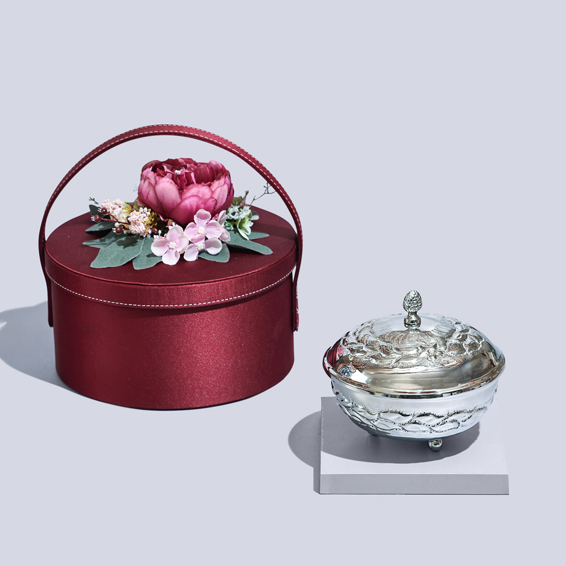 A decorative silver bowl with a lid in an embroidered, round box with a handle.