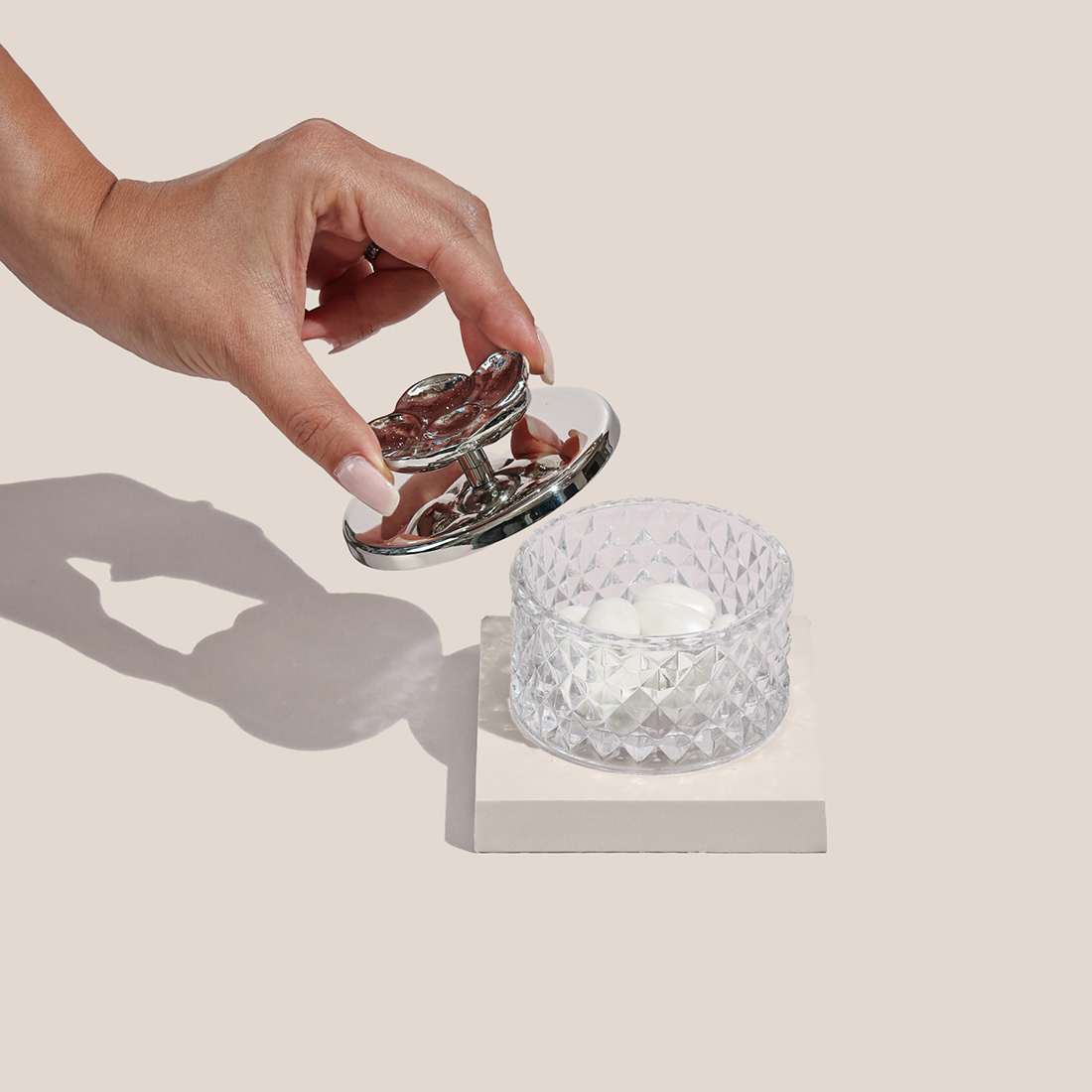 JOD38A glass bonbonniere with a lid holding a bag of sugared almonds in a decorated plexi box.Select options This product has multiple variants. The options may be chosen on the product page Details -