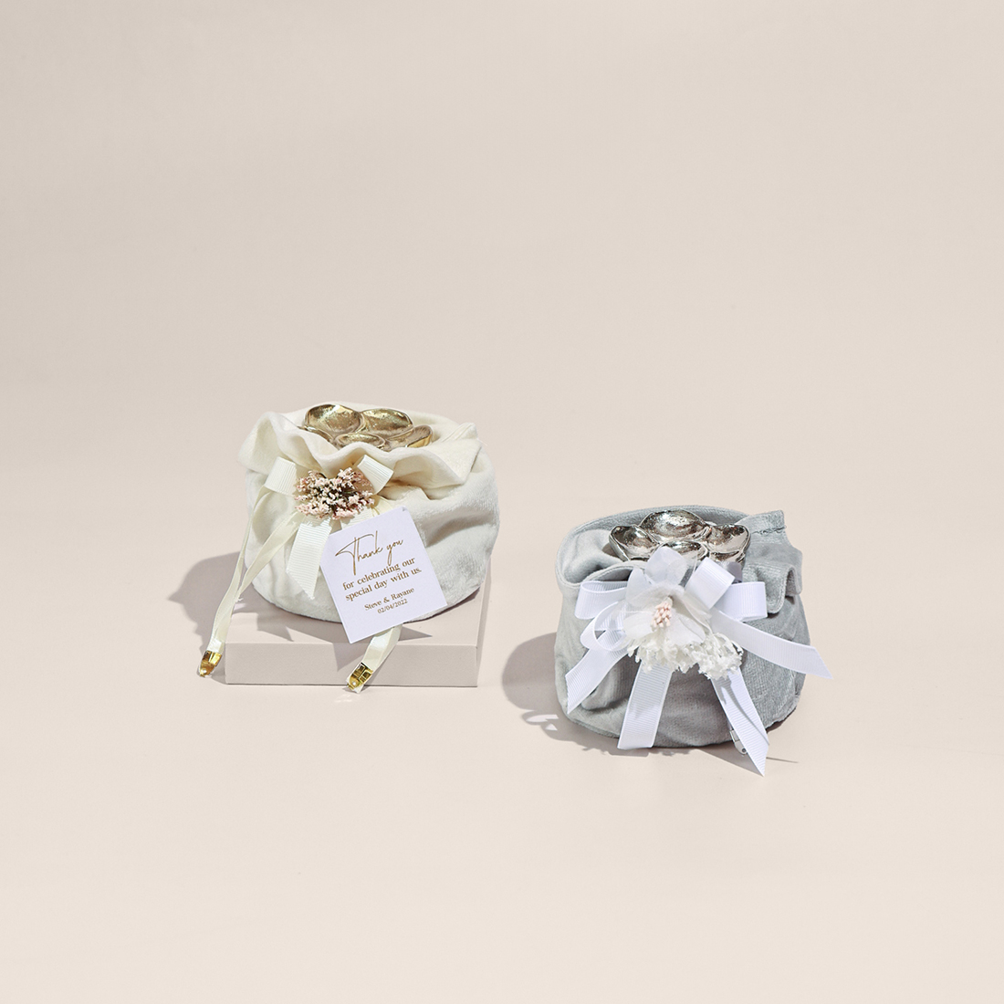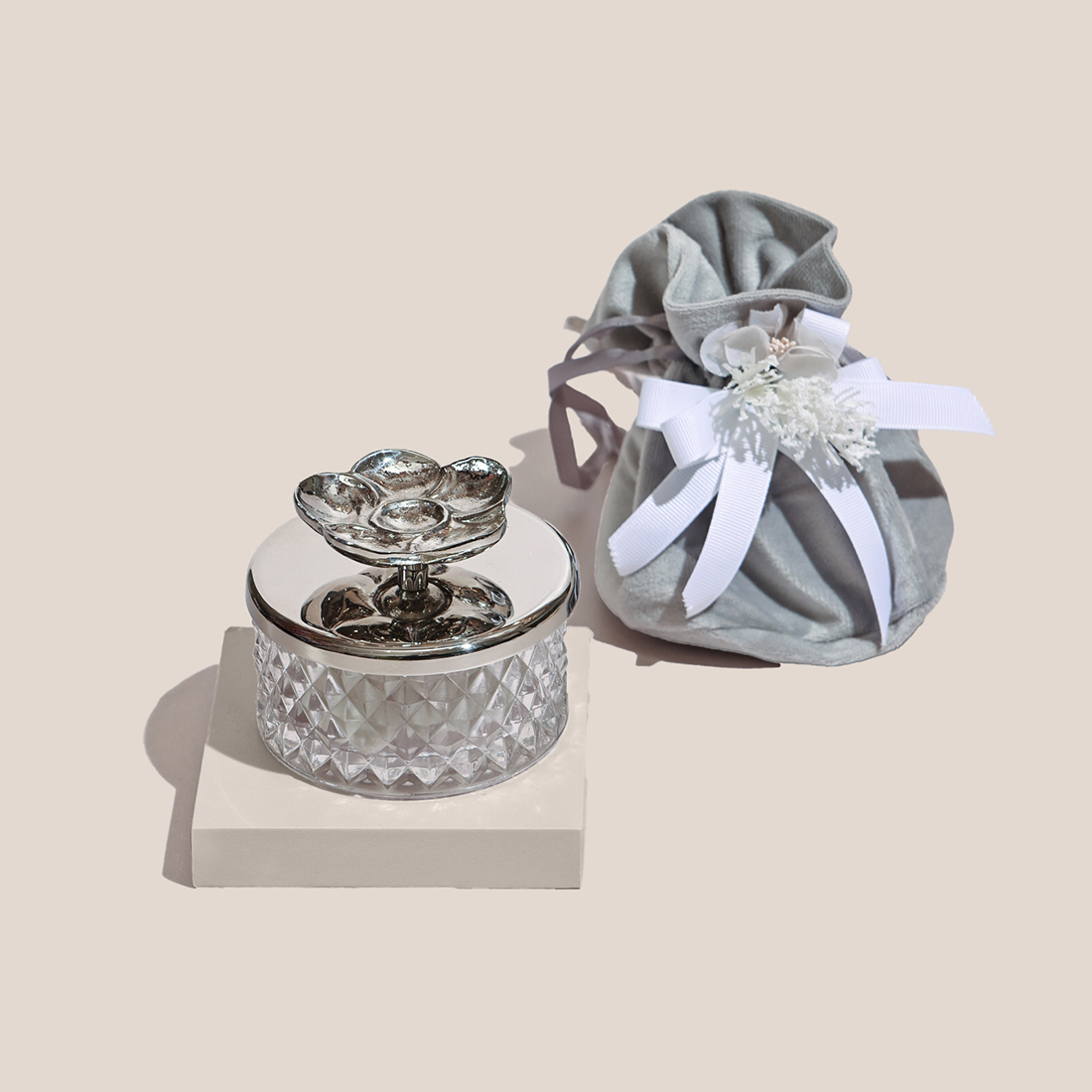 A glass bonbonniere with a floral metallic cover, filled with sugared almonds and placed in a decorated velvet pouch.