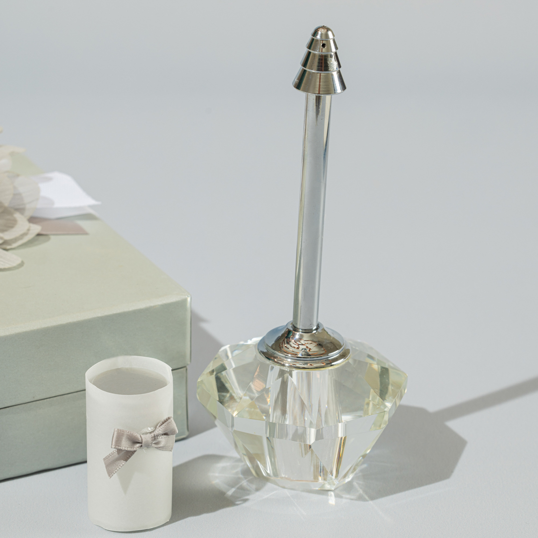 A crystal fragrance diffuser with a bottle of incense in a decorated box
