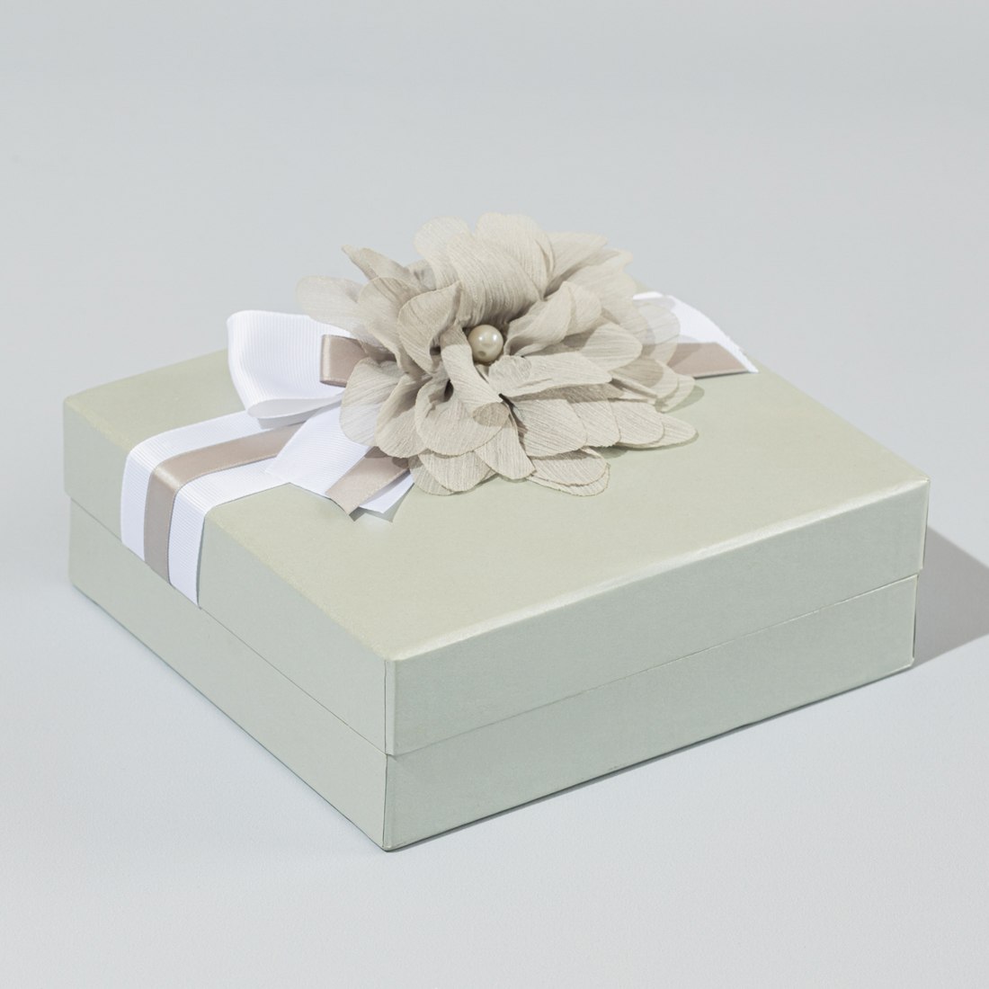 JOD75A silver bonbonniere with a floral handle, presented in a decorated box with an engraved nameplate. -