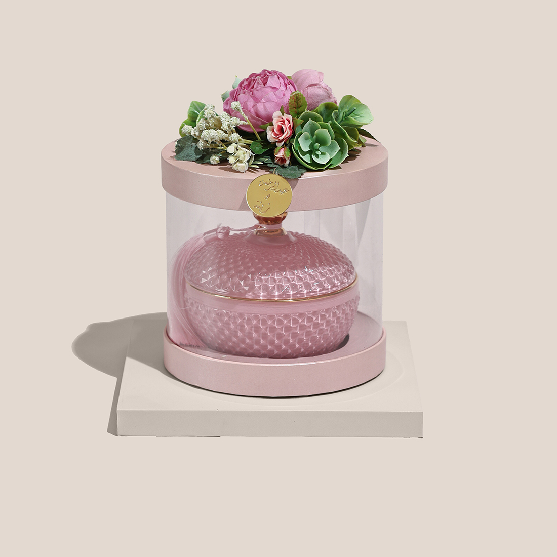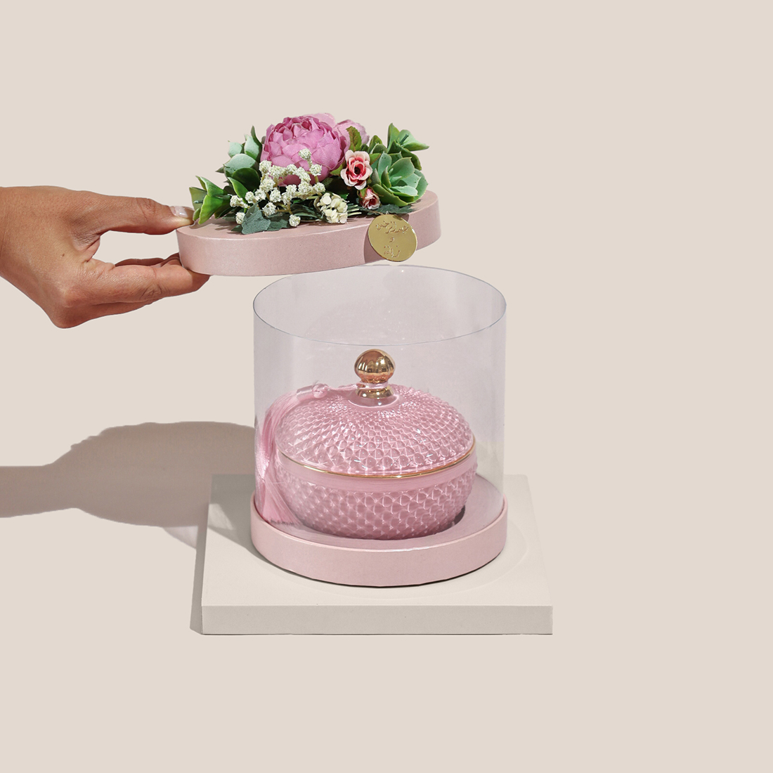 JOD40A pink, round glass candle with a lid and matching silk tassel in a white floral box. -