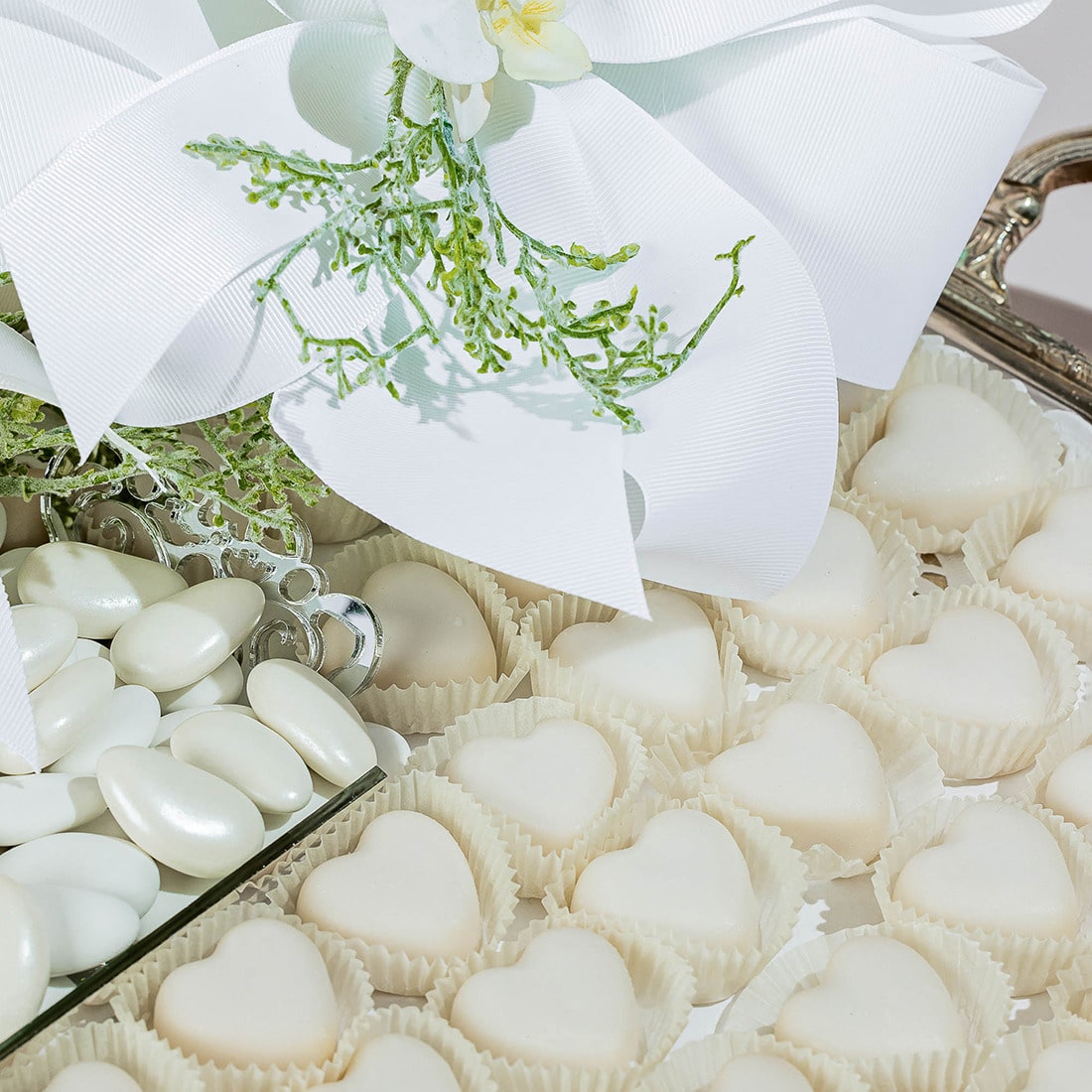 A decorated, silver tray with handles holding 1.5 kg of heart-shaped fondants and 0.5 kg of white sugared almonds